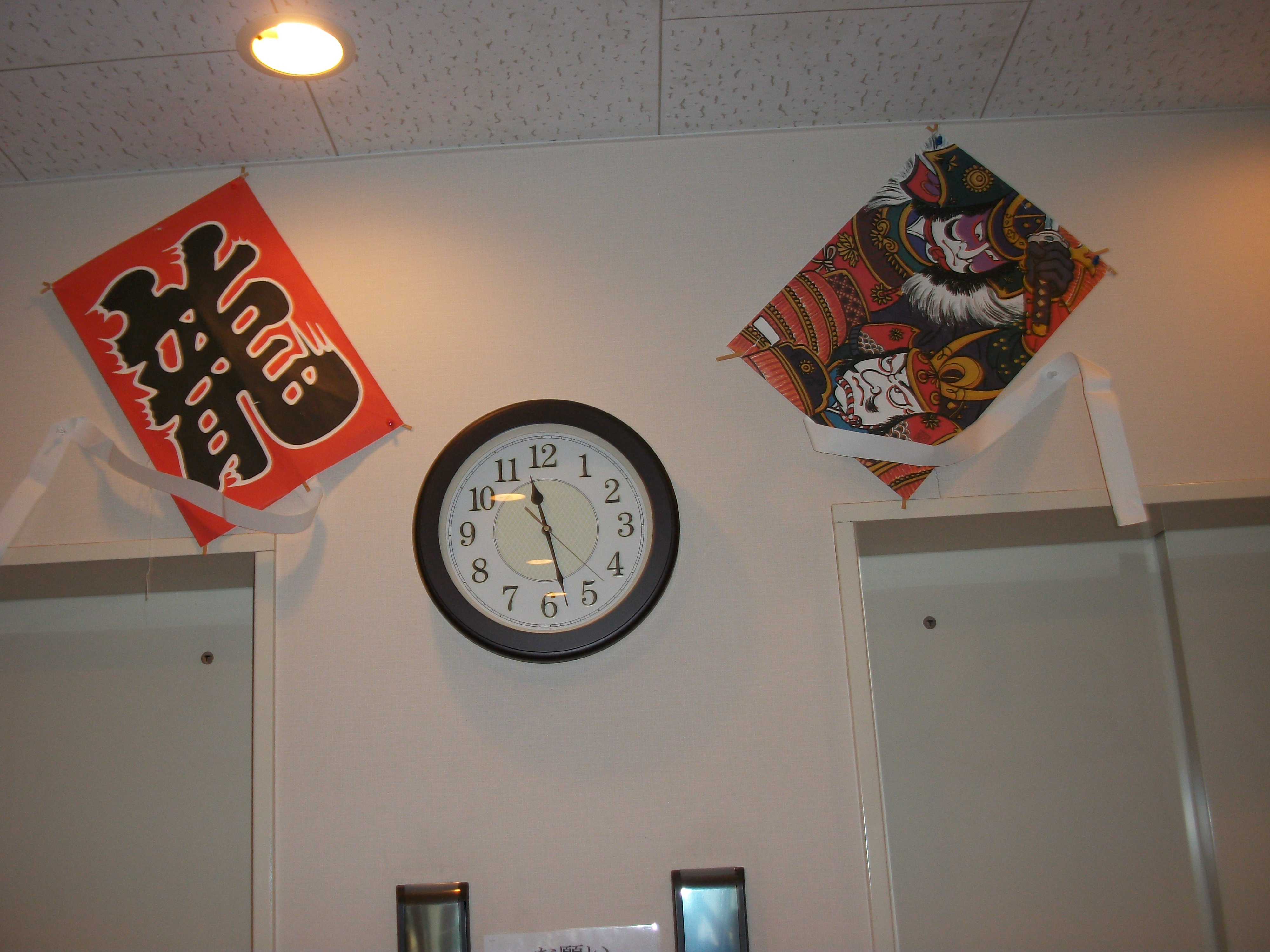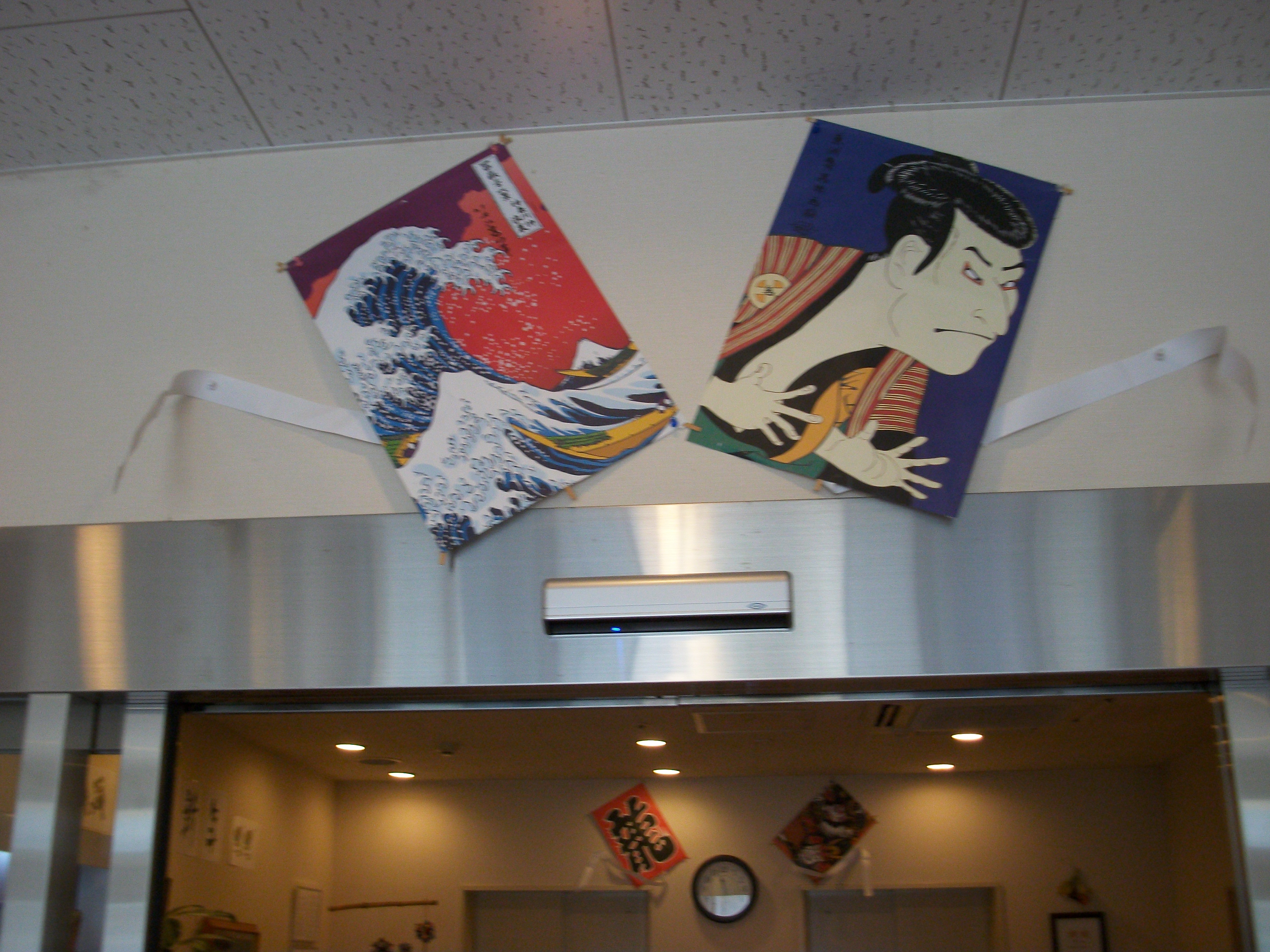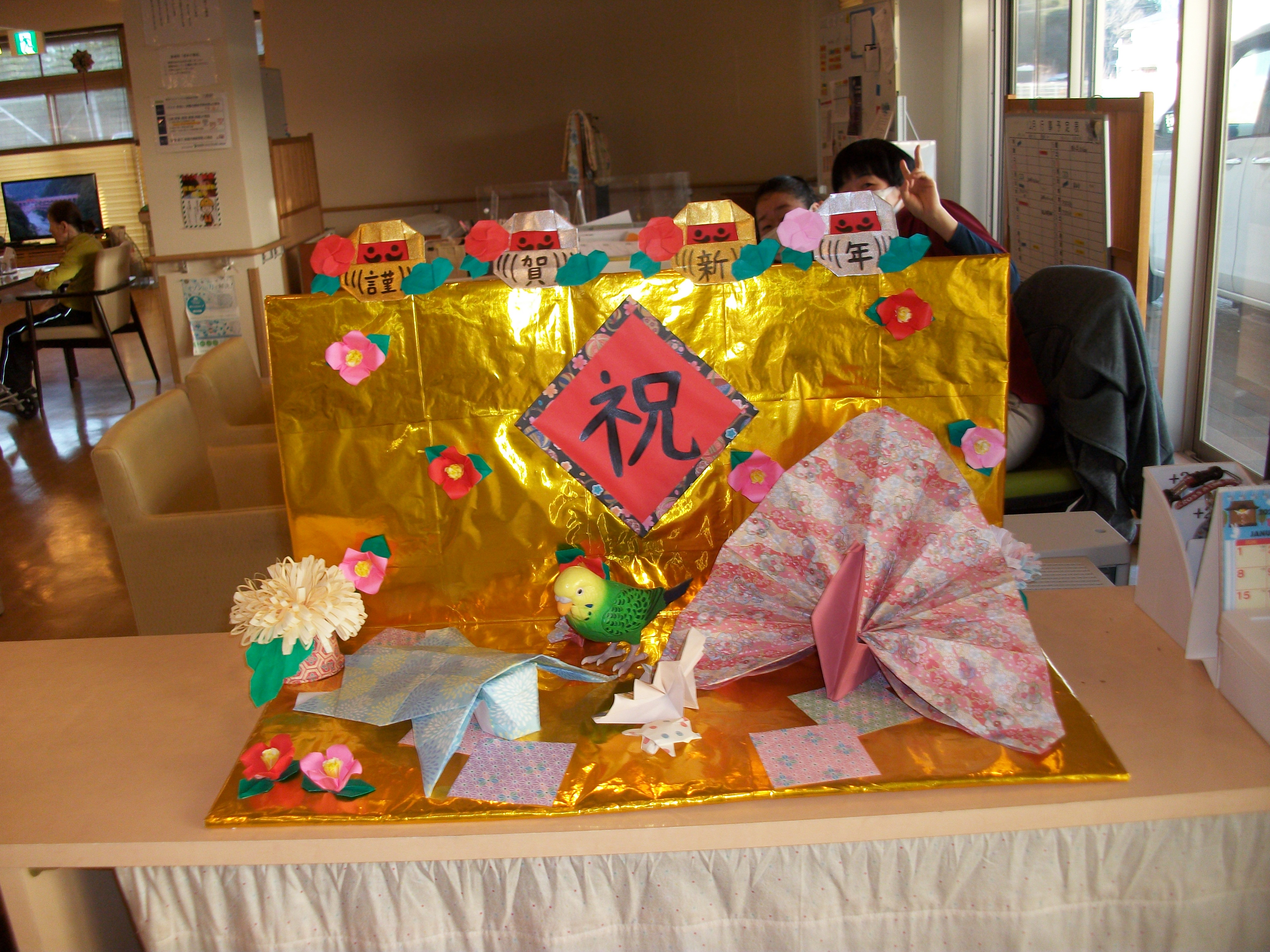 立派な門松が玄関先に、駐車場入り口には手作りの門松、建物に入ると凧やおめでたい生花が