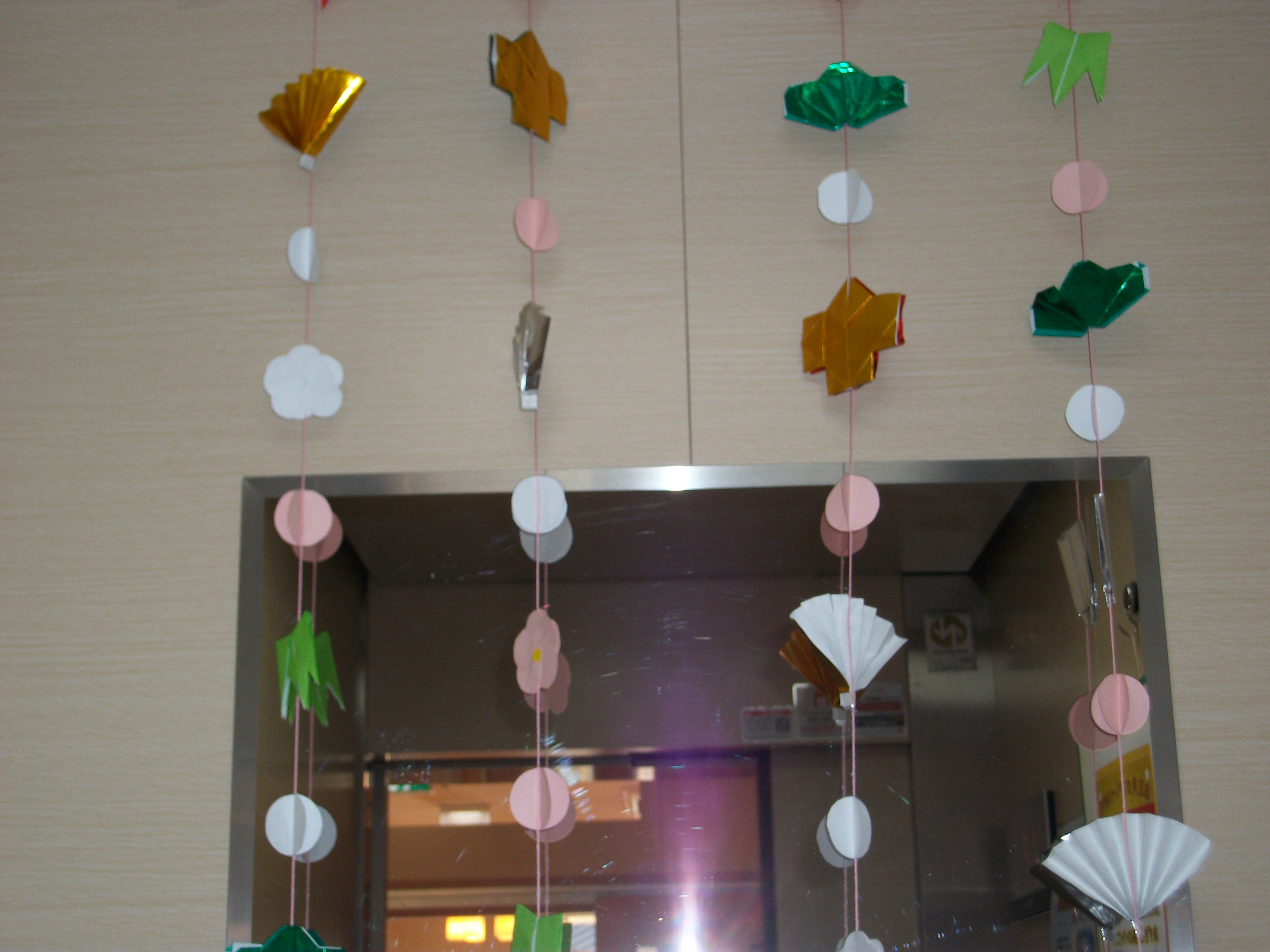 エレベーターの中には、楽リハのご利用者様が作っていただいたモールが飾られおります。