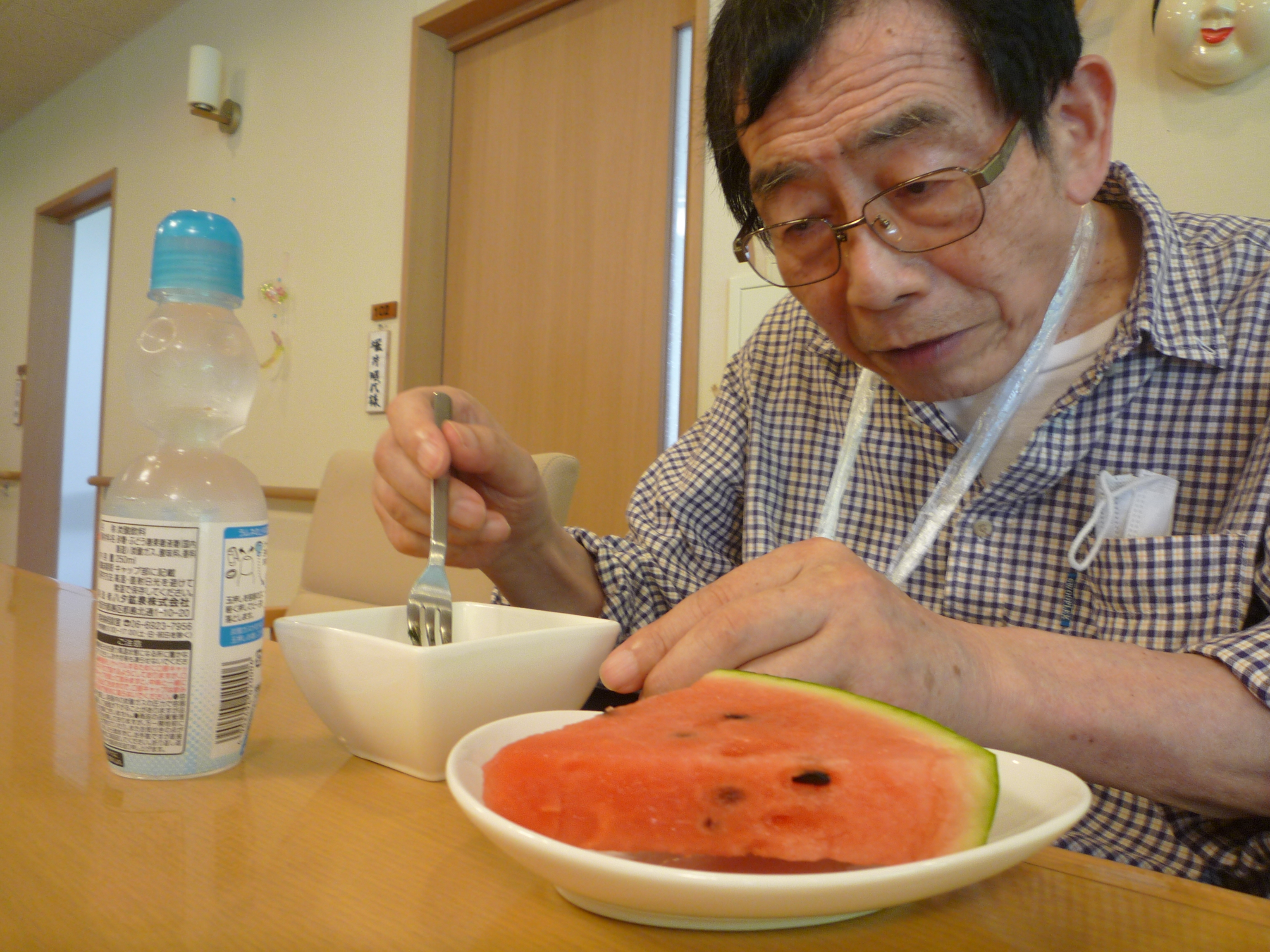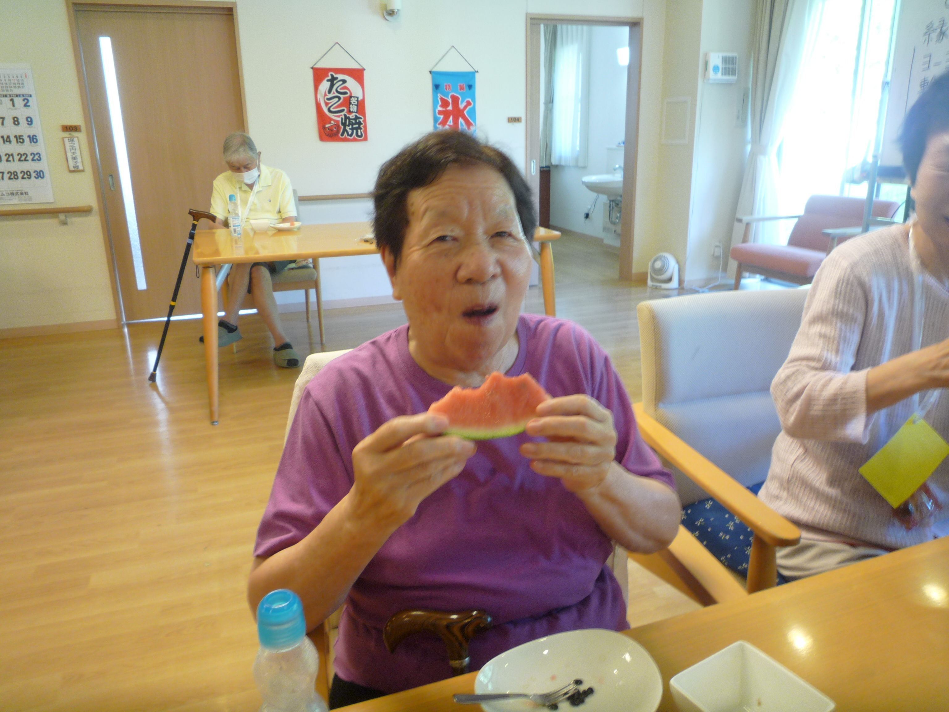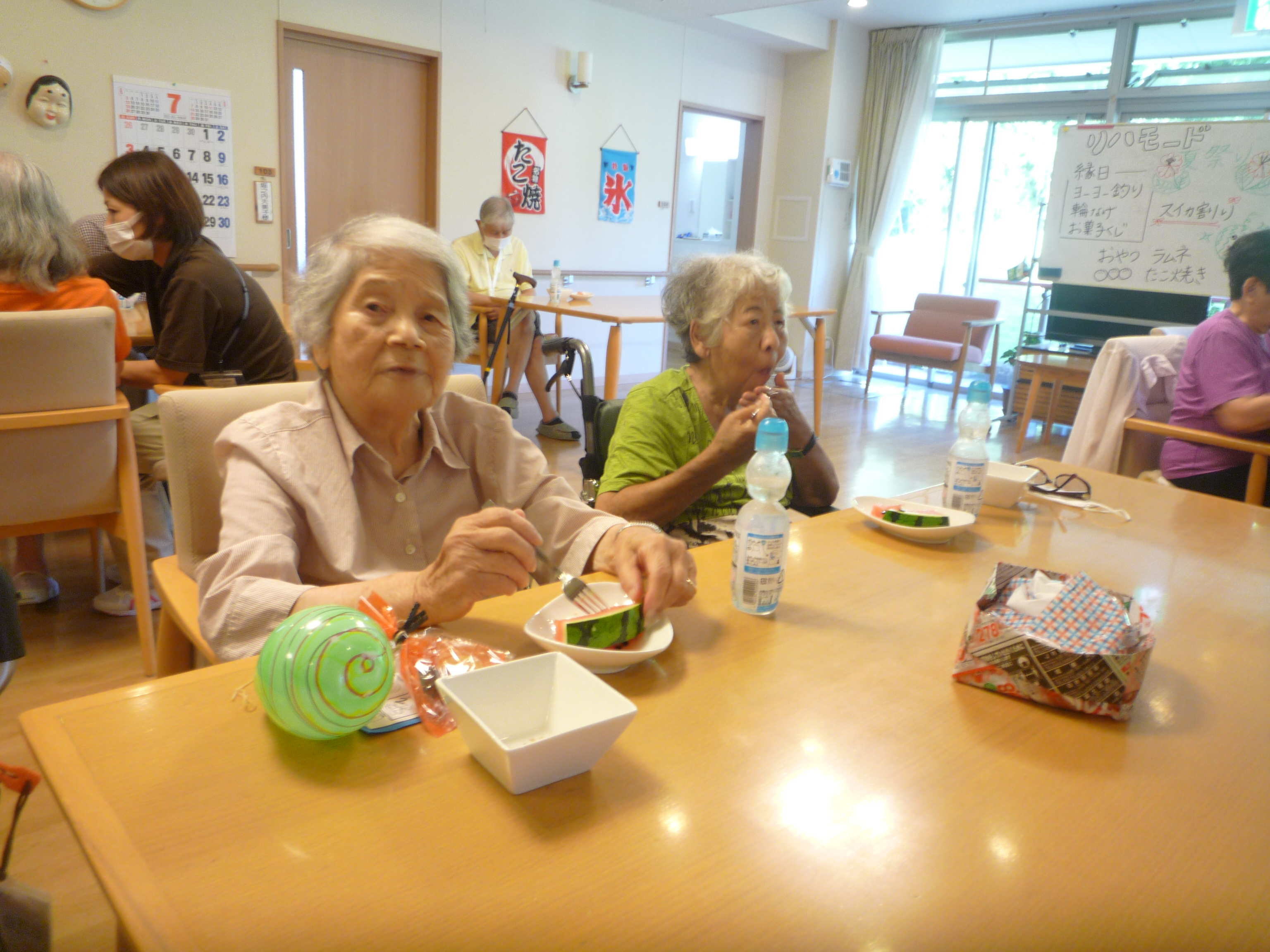 ゲットした、ラムネとたこ焼きと🍉を皆さんで、「いただきま~す」
