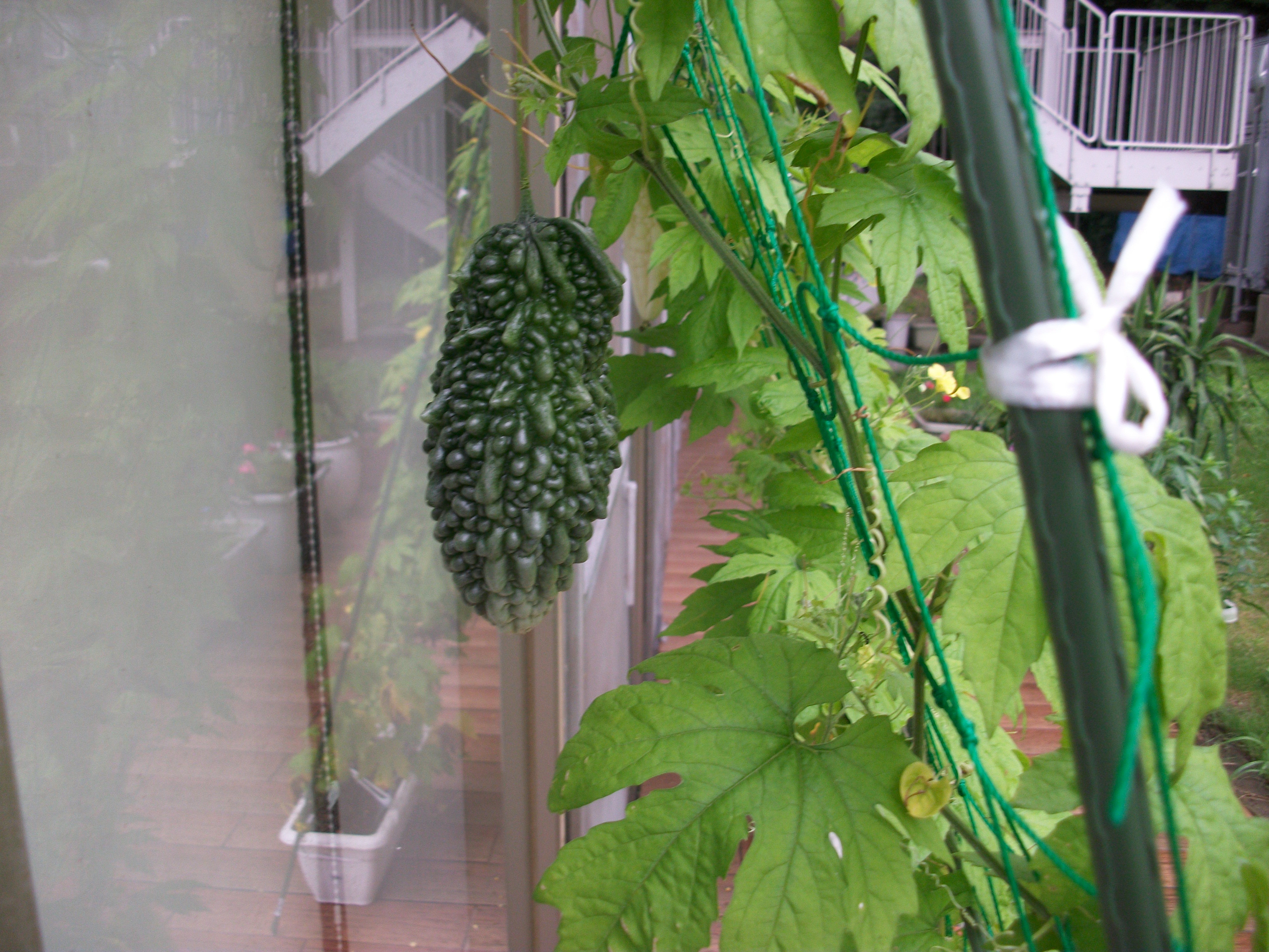 ゴーヤカーテンがすごい勢いで成長して、大きなゴーヤの実をつけて