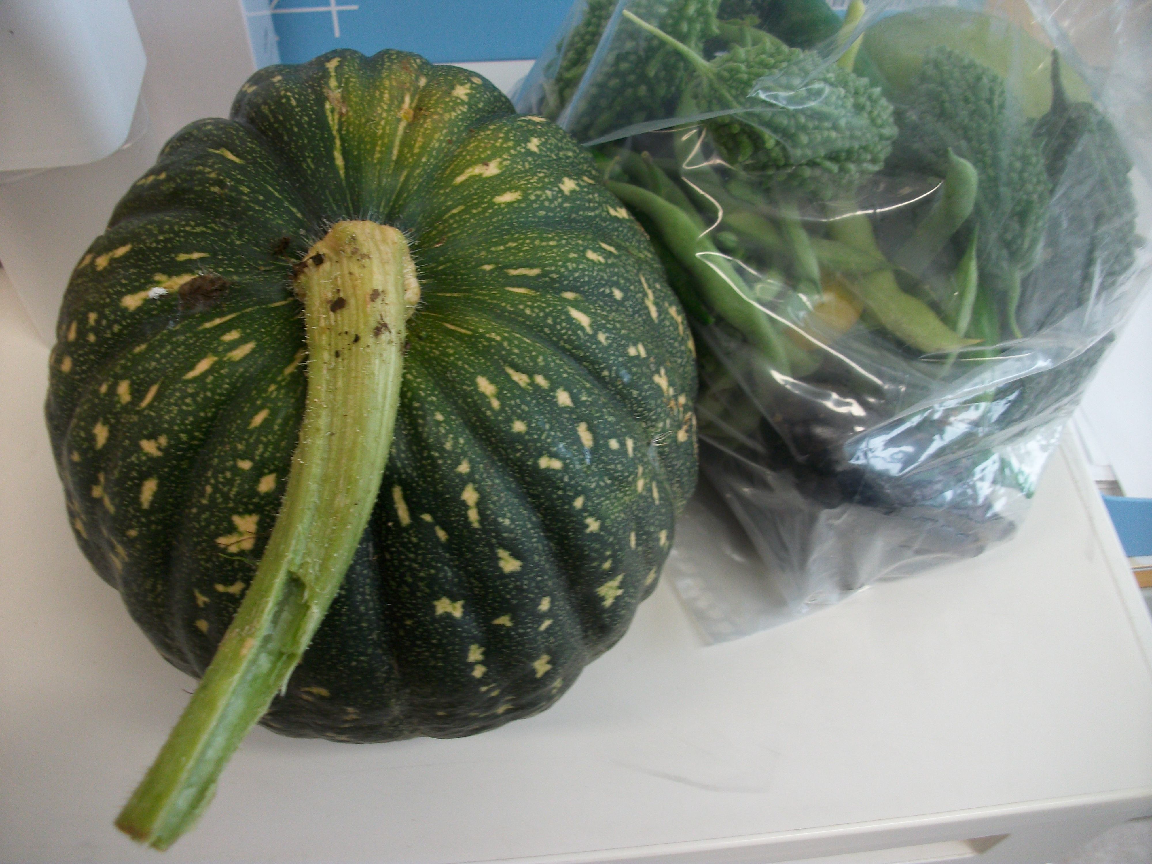 畑で収穫した野菜、きゅぅりと白きゅうり、パプリカを