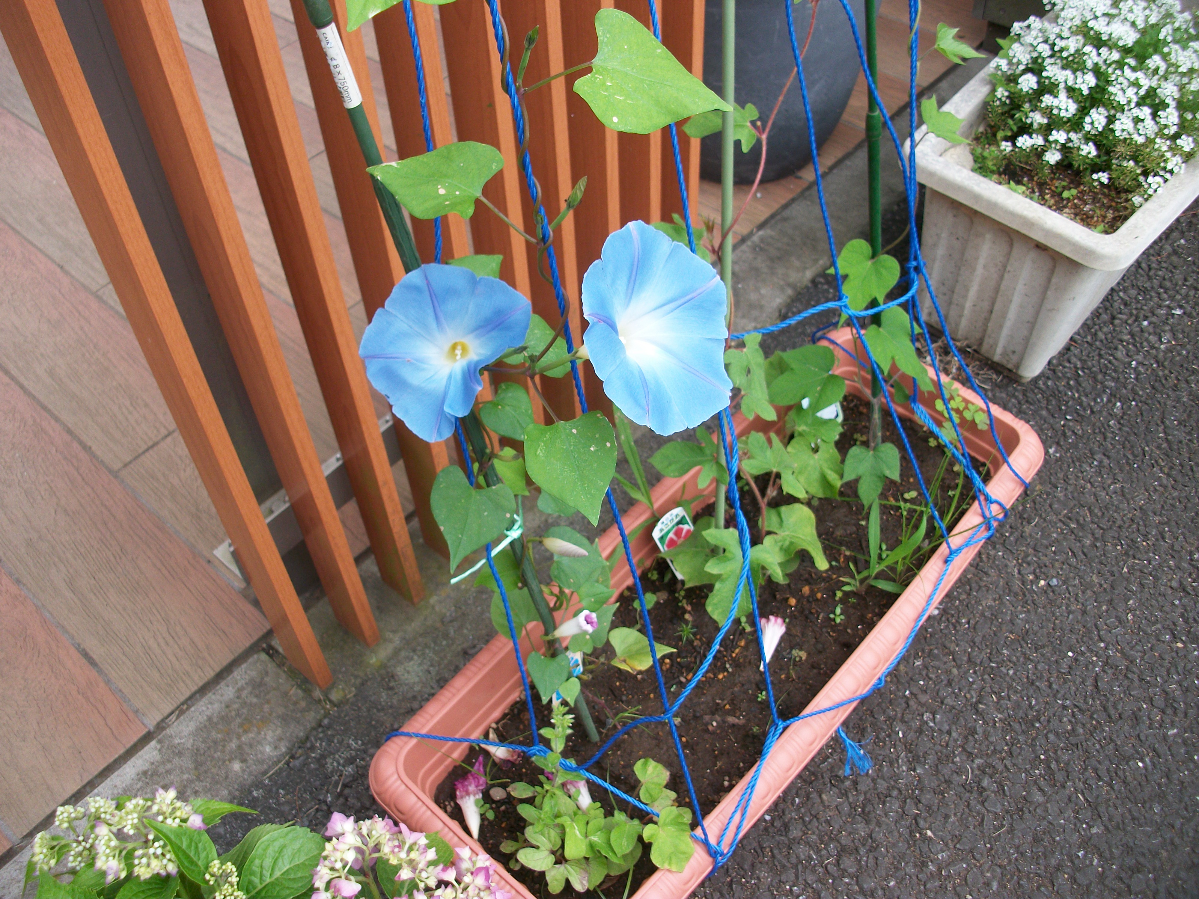 種から植えたプランターから、朝顔の弦が伸びて