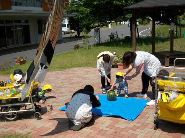 保育園で保護者様からいただいた🍉でスイカ割りを、園児たちが