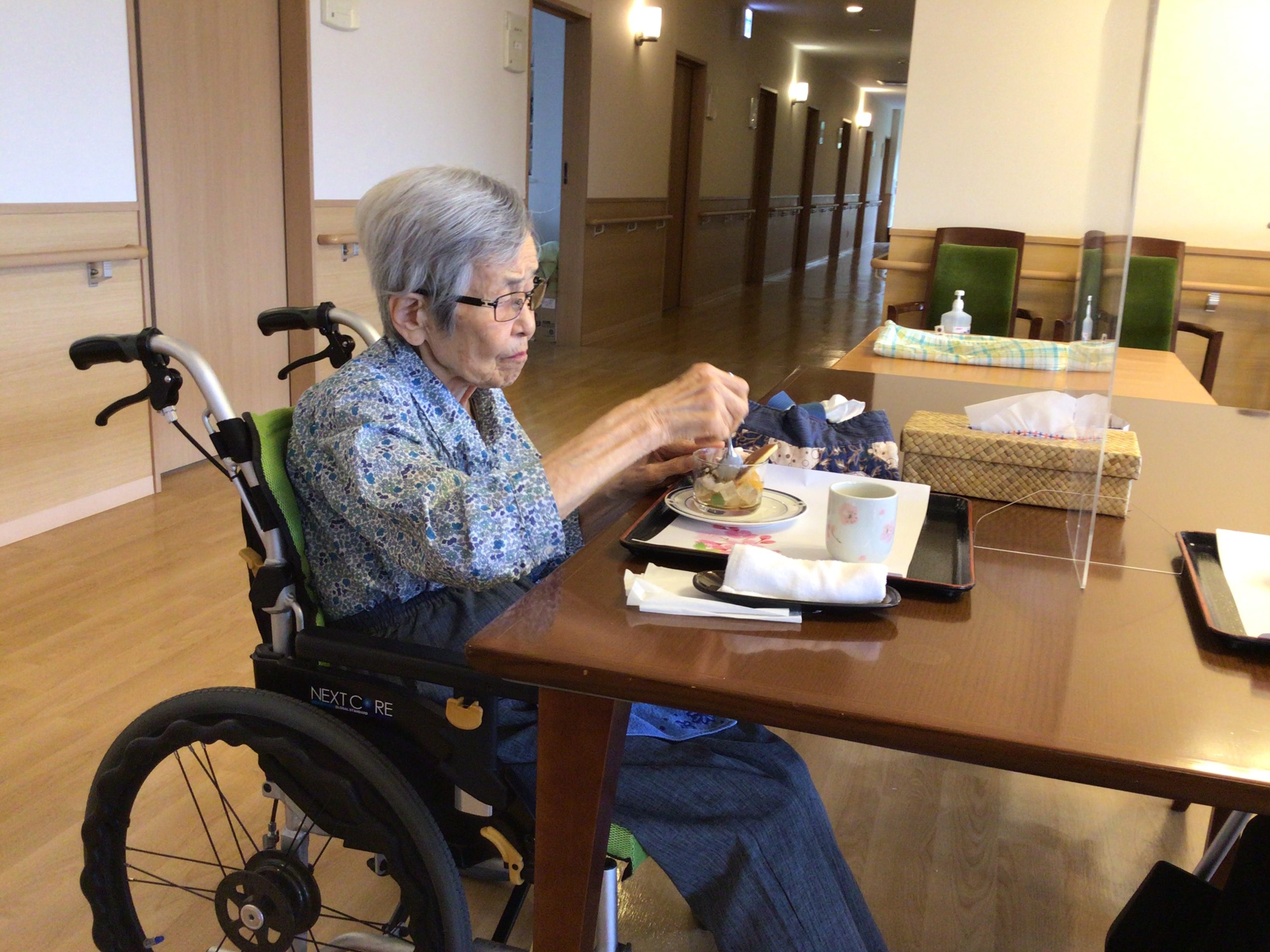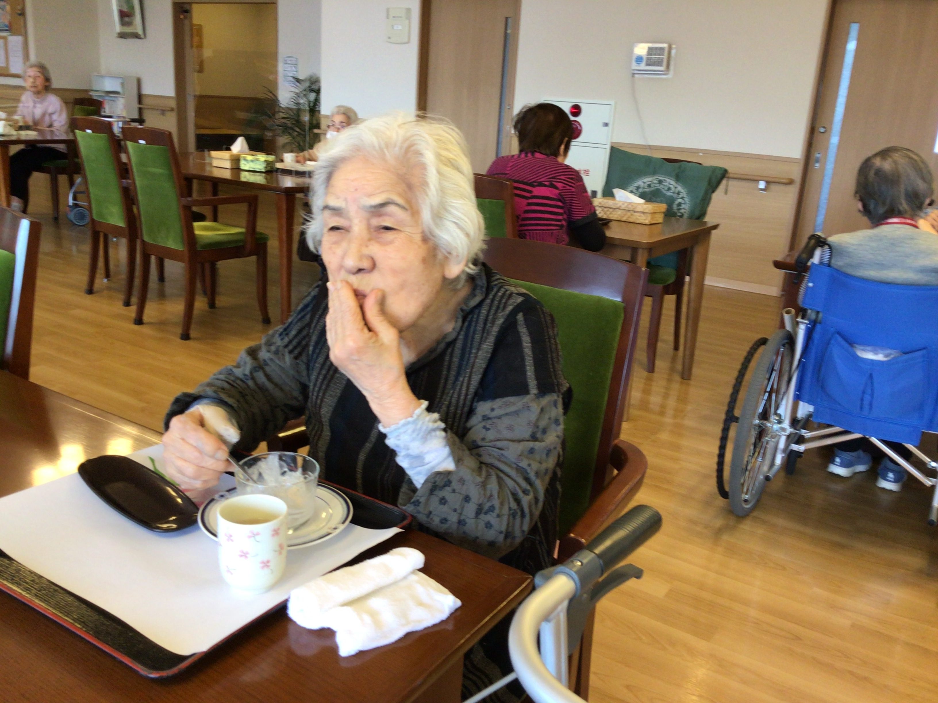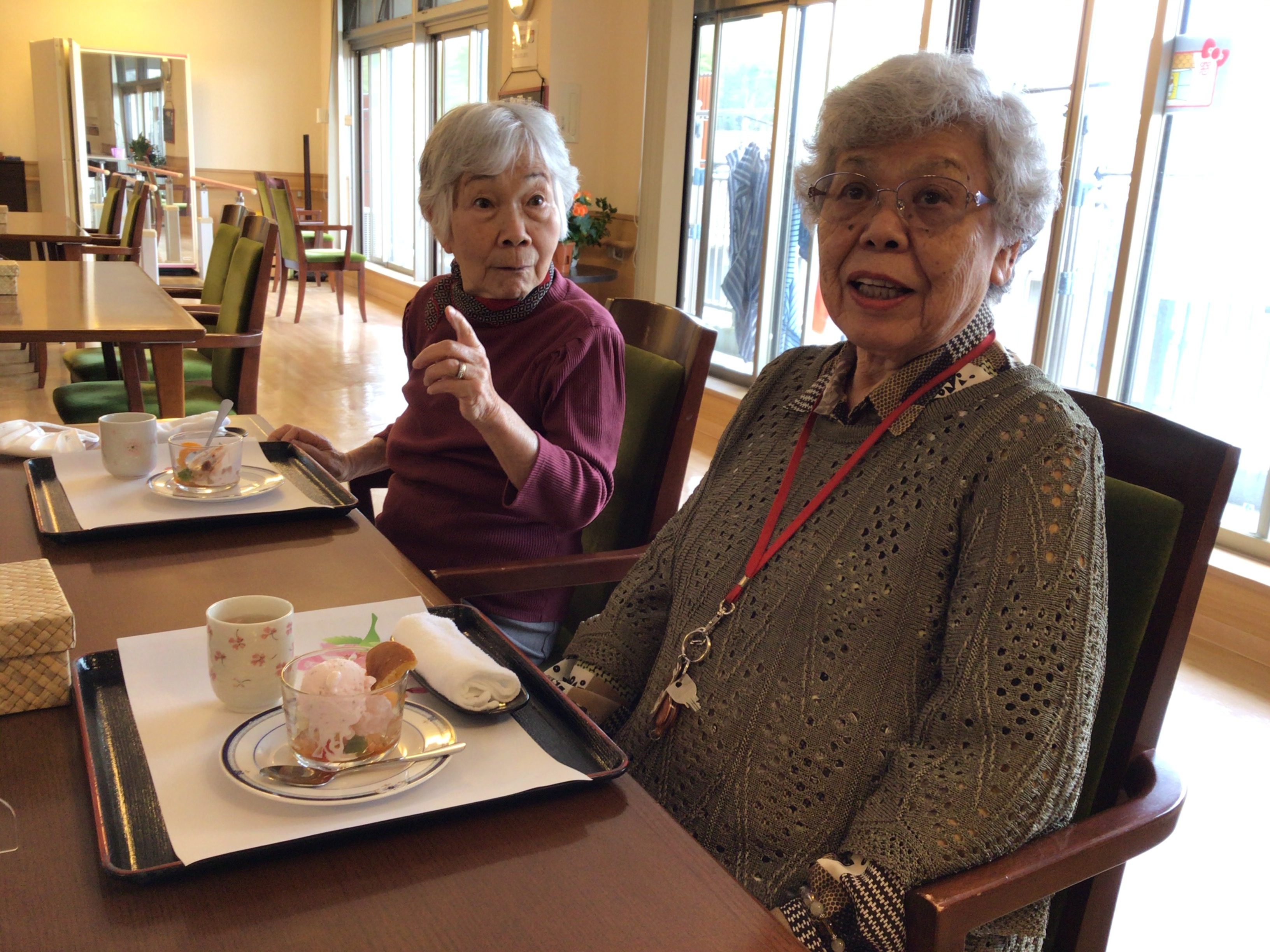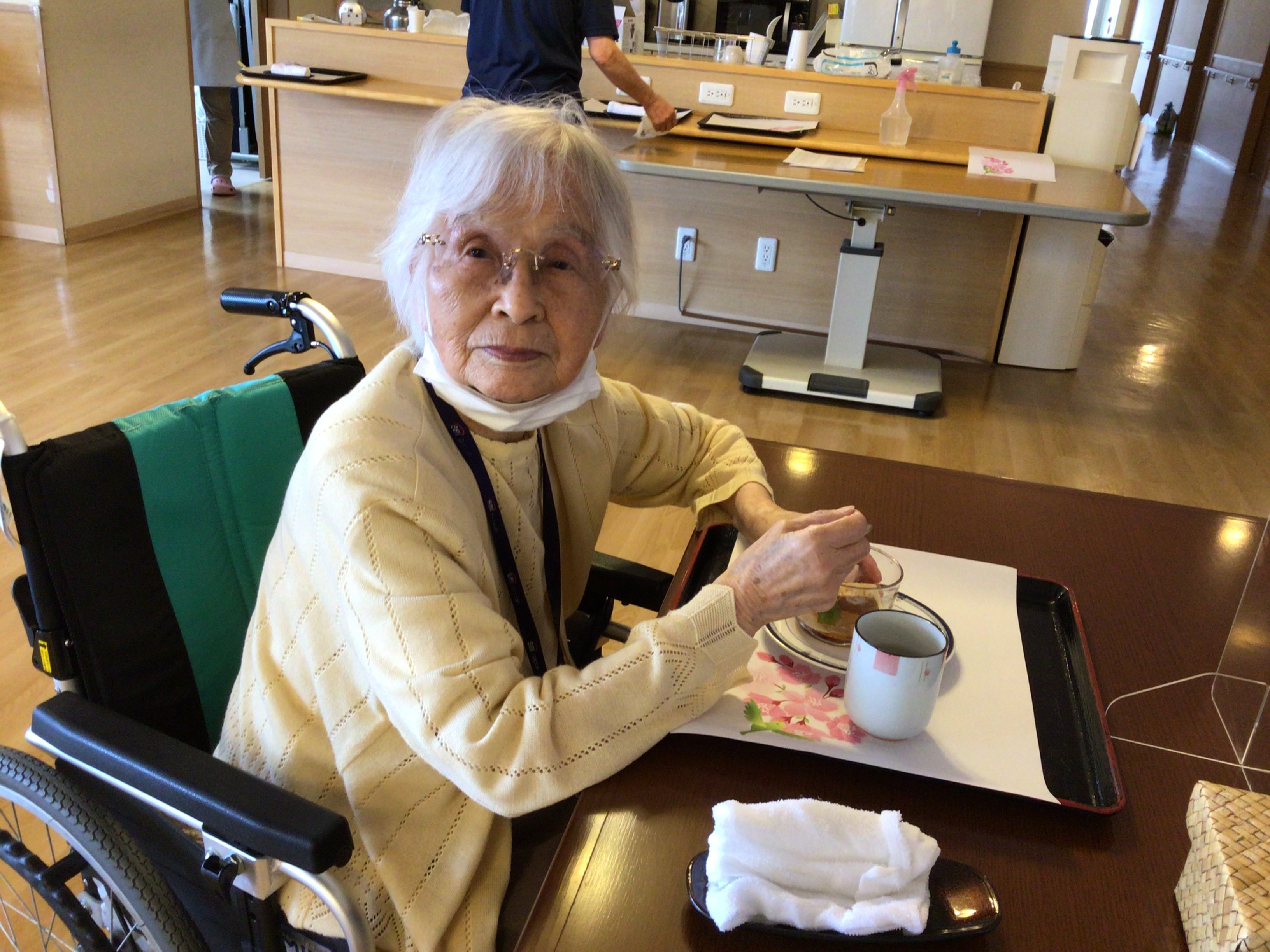 今月のすぺしゃるおやつは「さくらあんみつ」です。さくら茶を添えて。。。