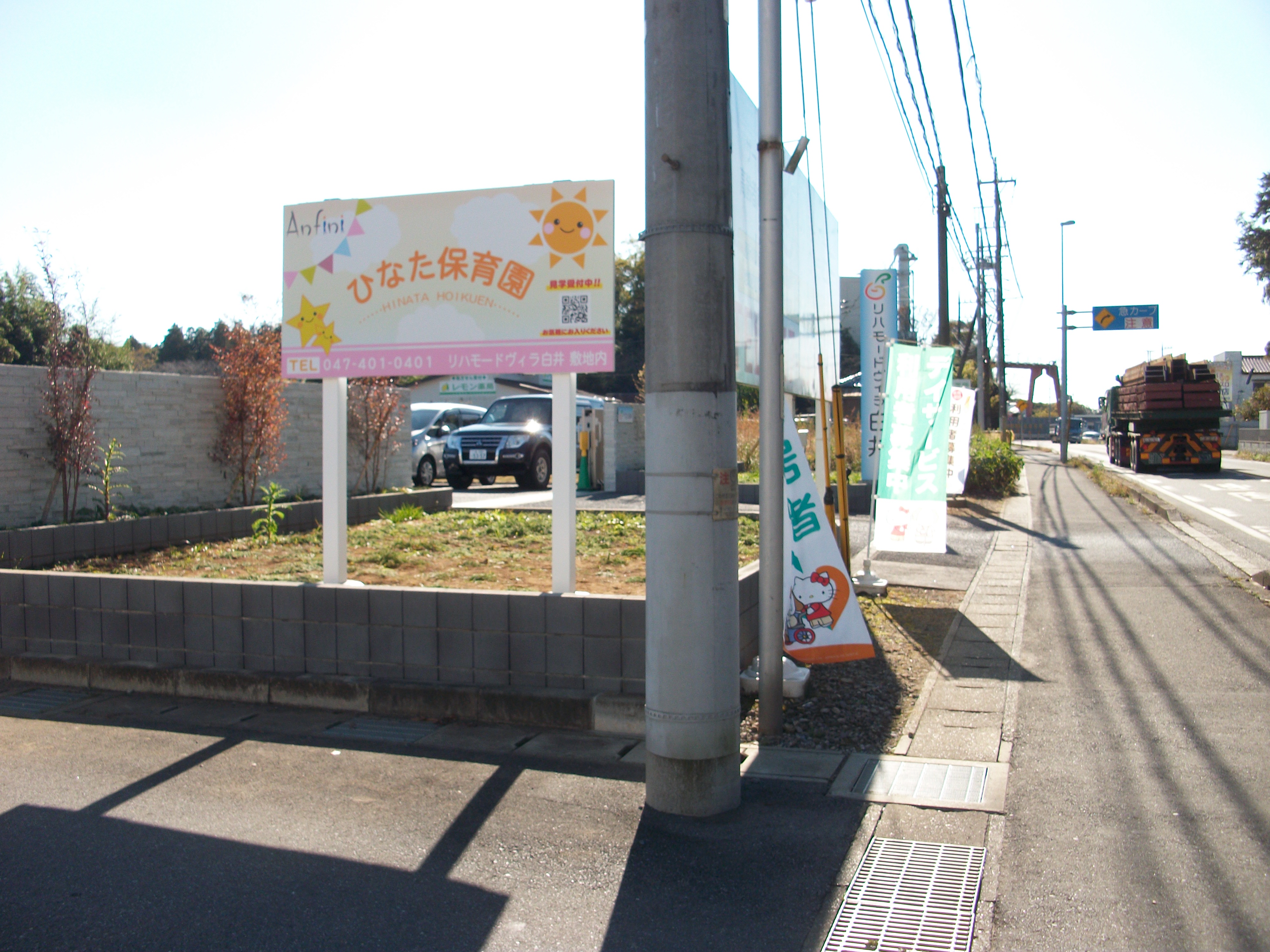 正面玄関にリハモードの大きい看板とならんで、ひなた保育園の看板が設置されました!