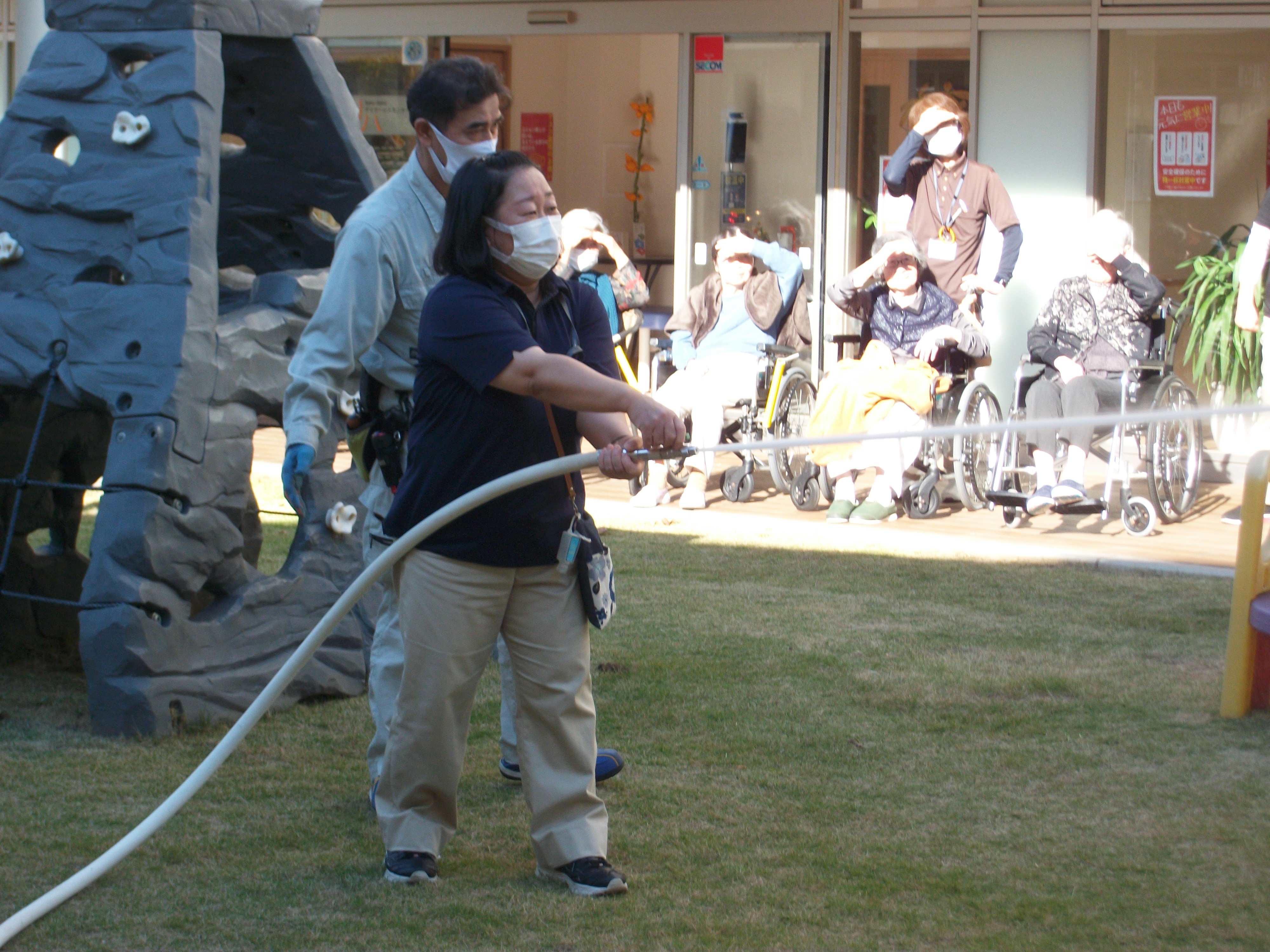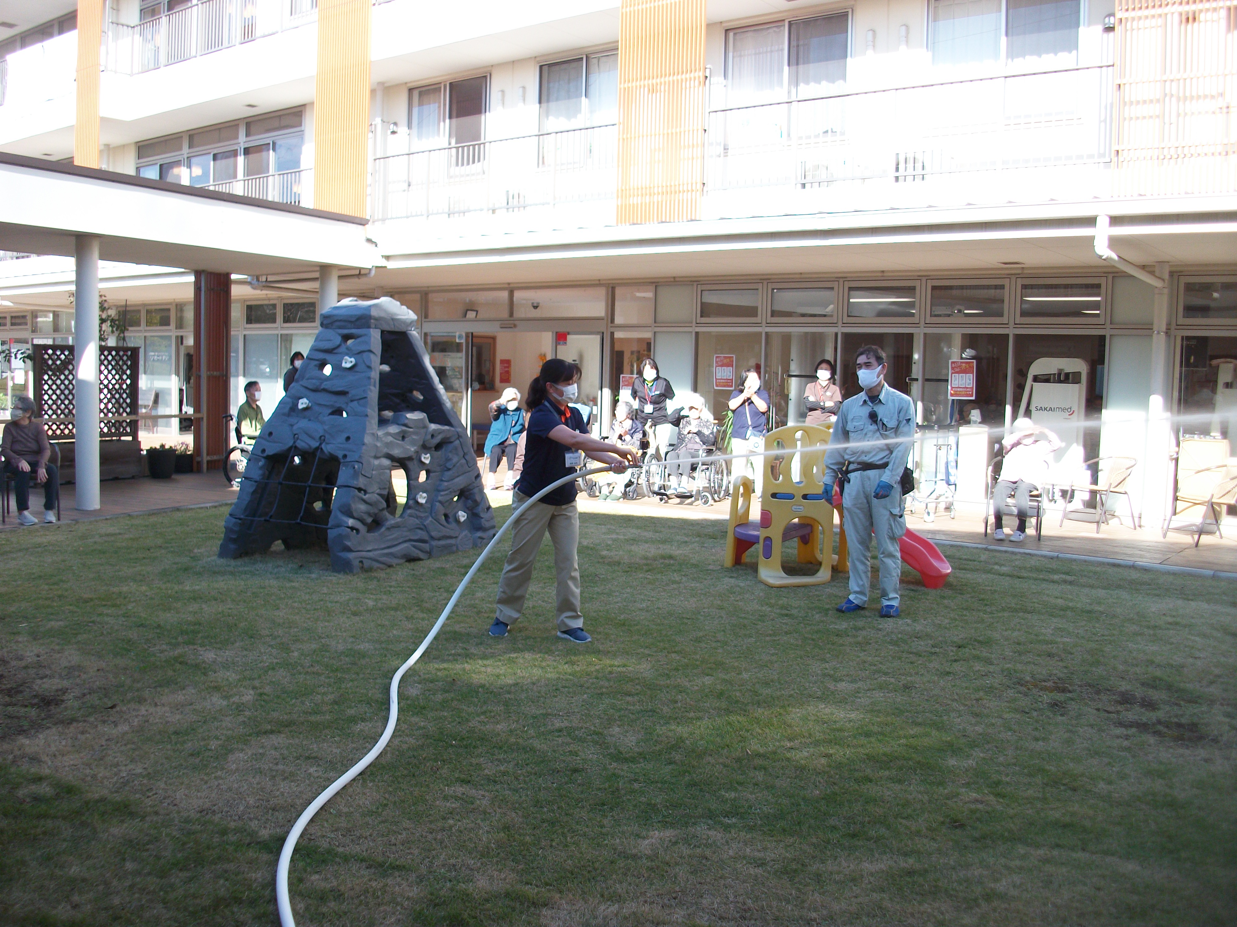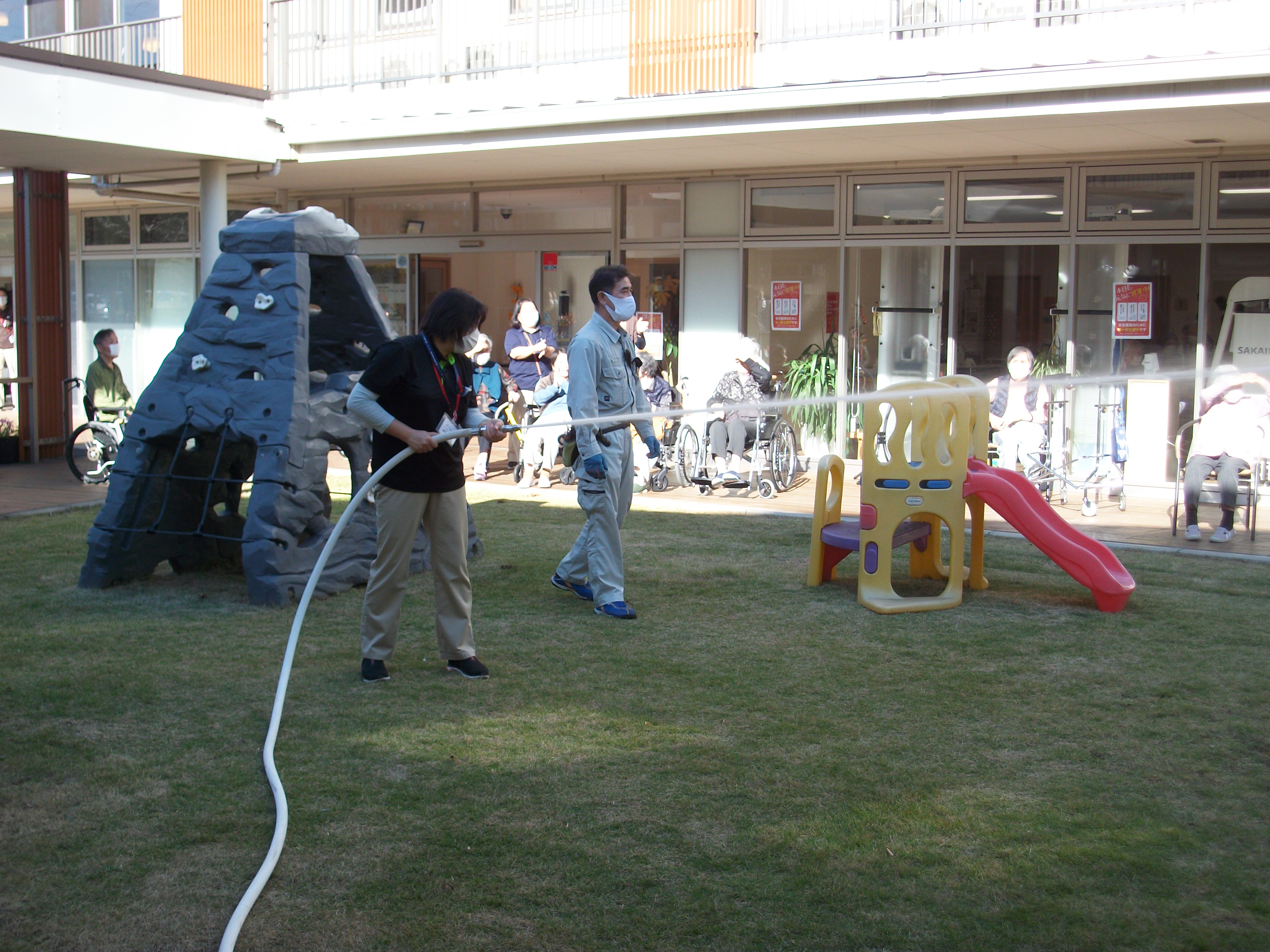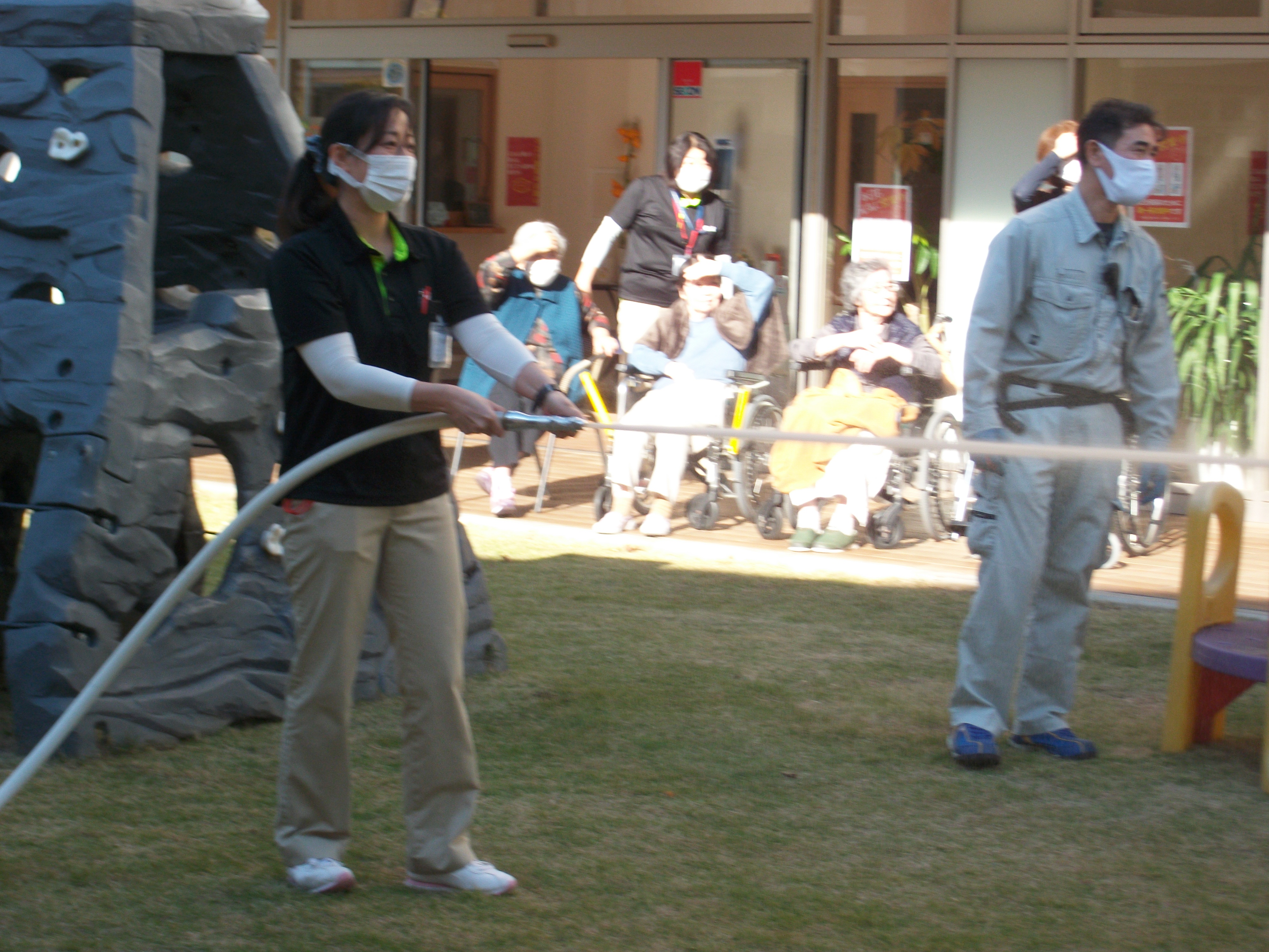 暖かい陽気でしたので、ケアの利用者様と一緒に放水訓練です!