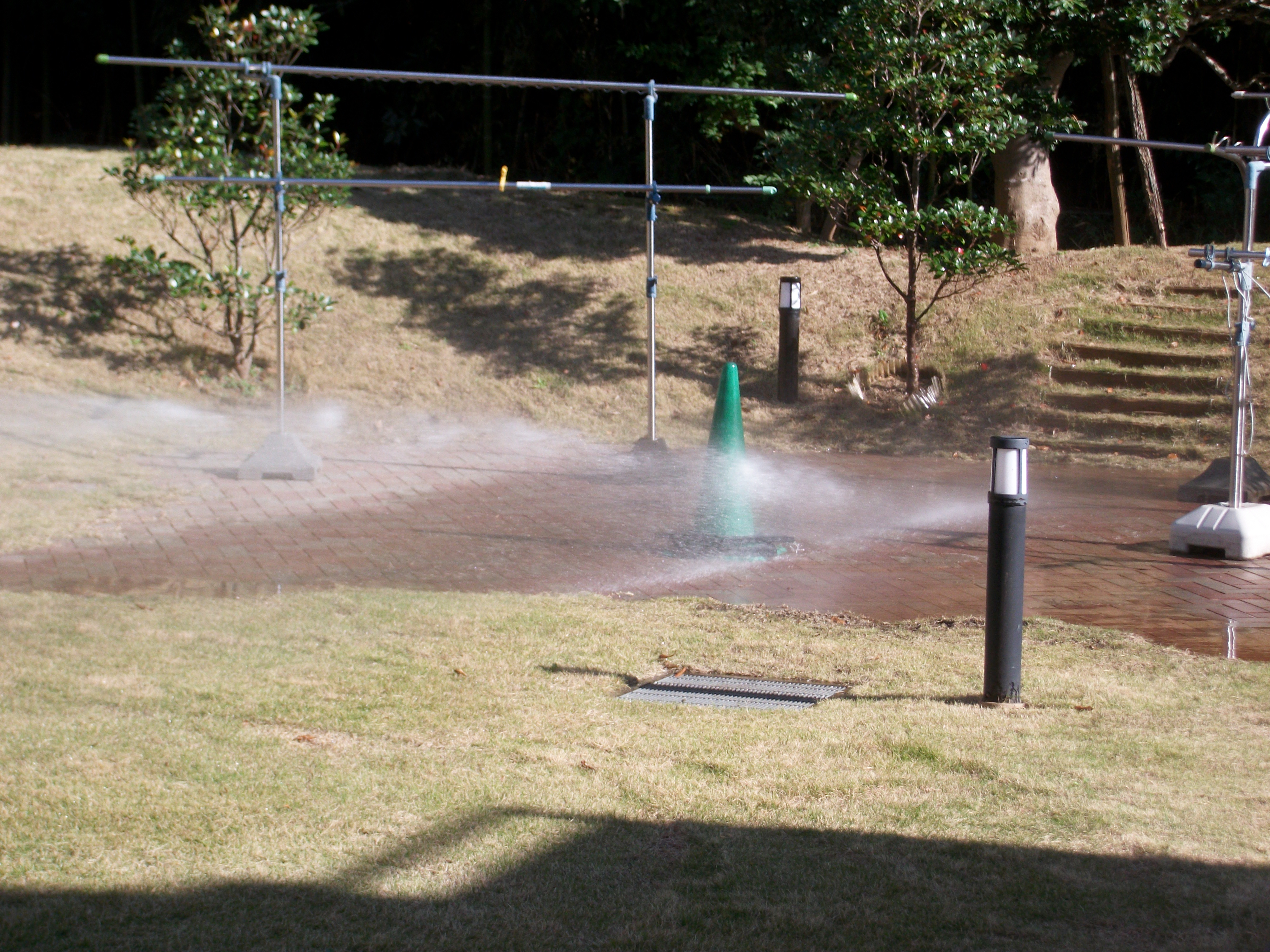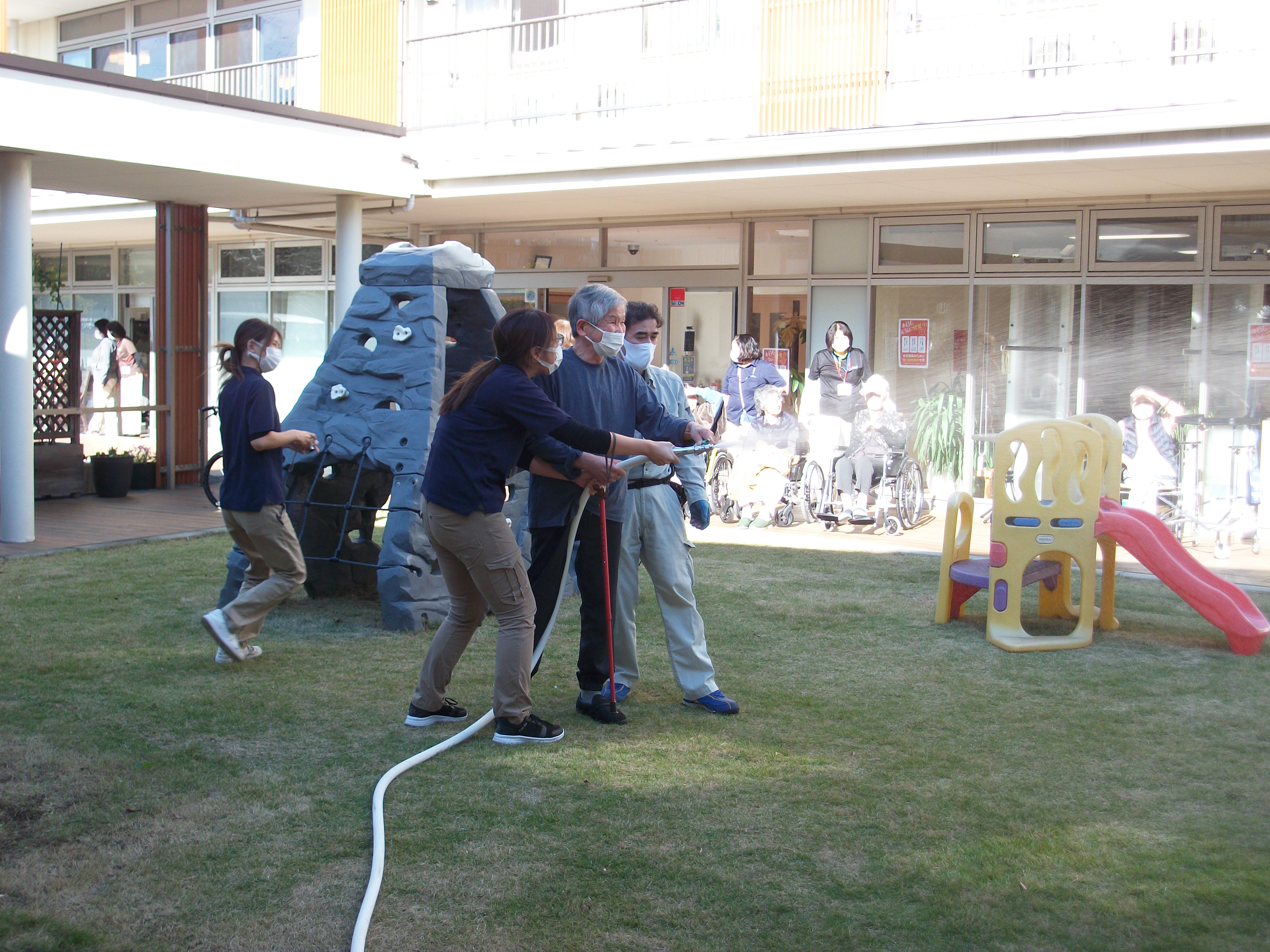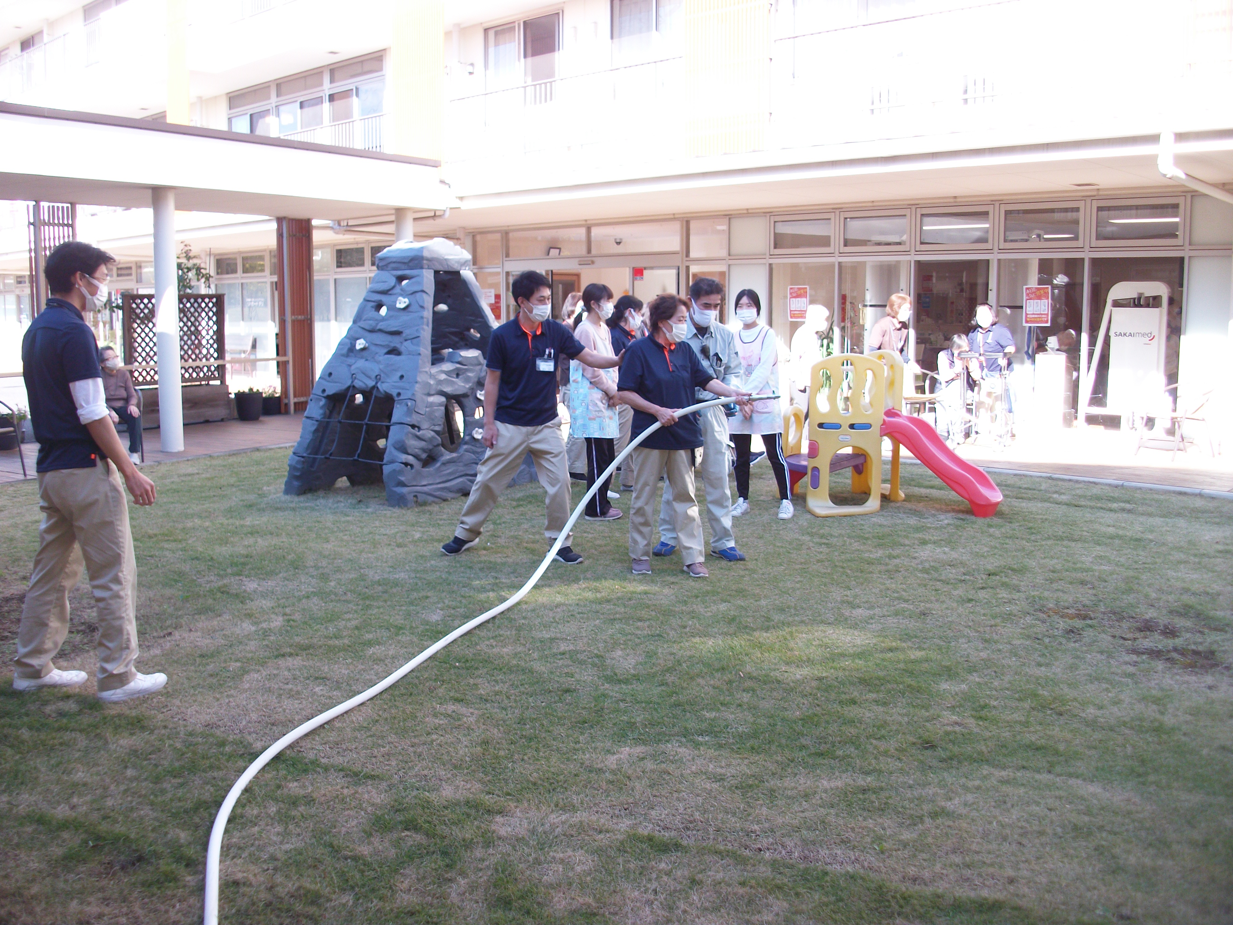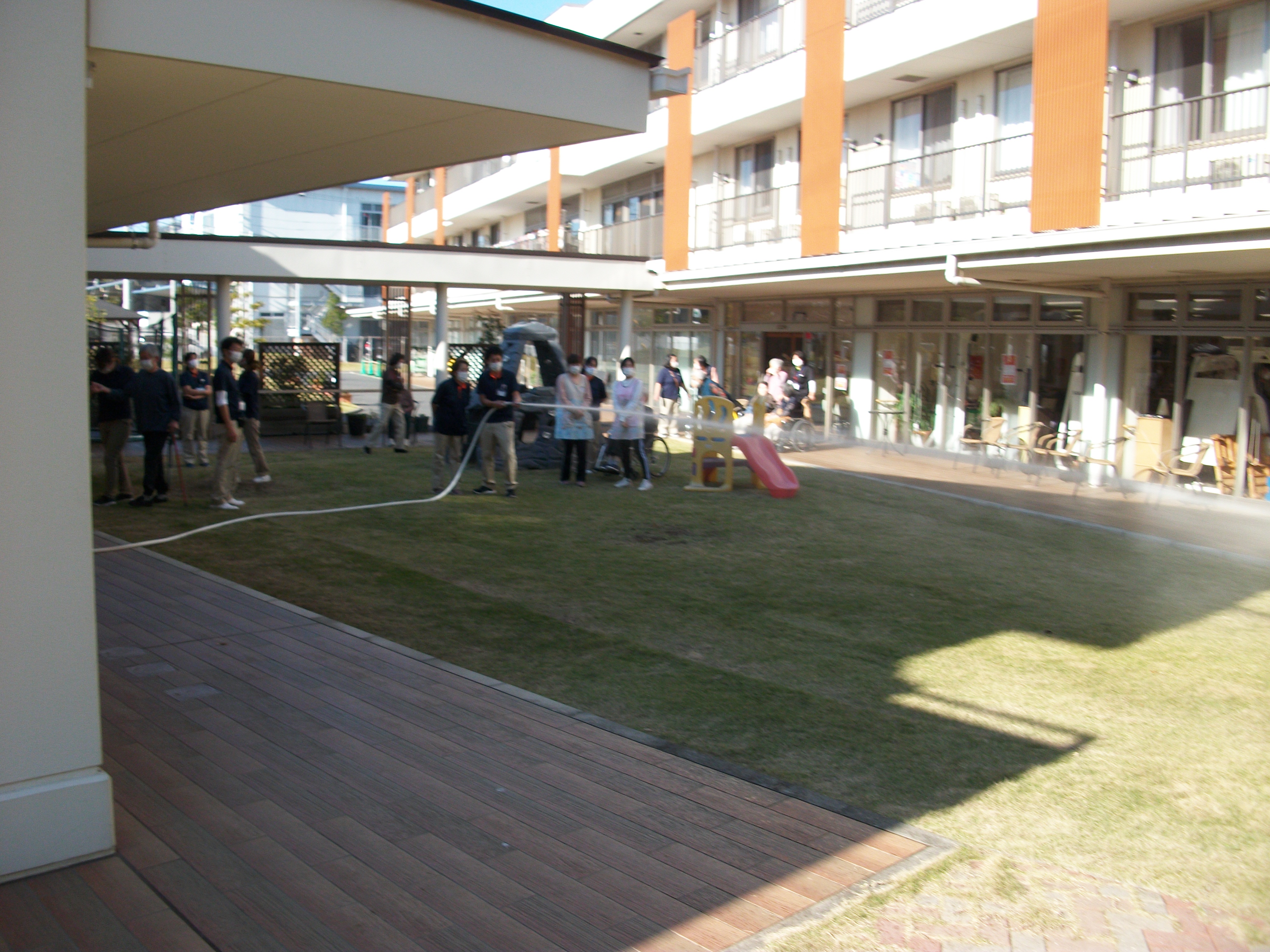 暖かい陽気でしたので、ケアの利用者様と一緒に放水訓練です!