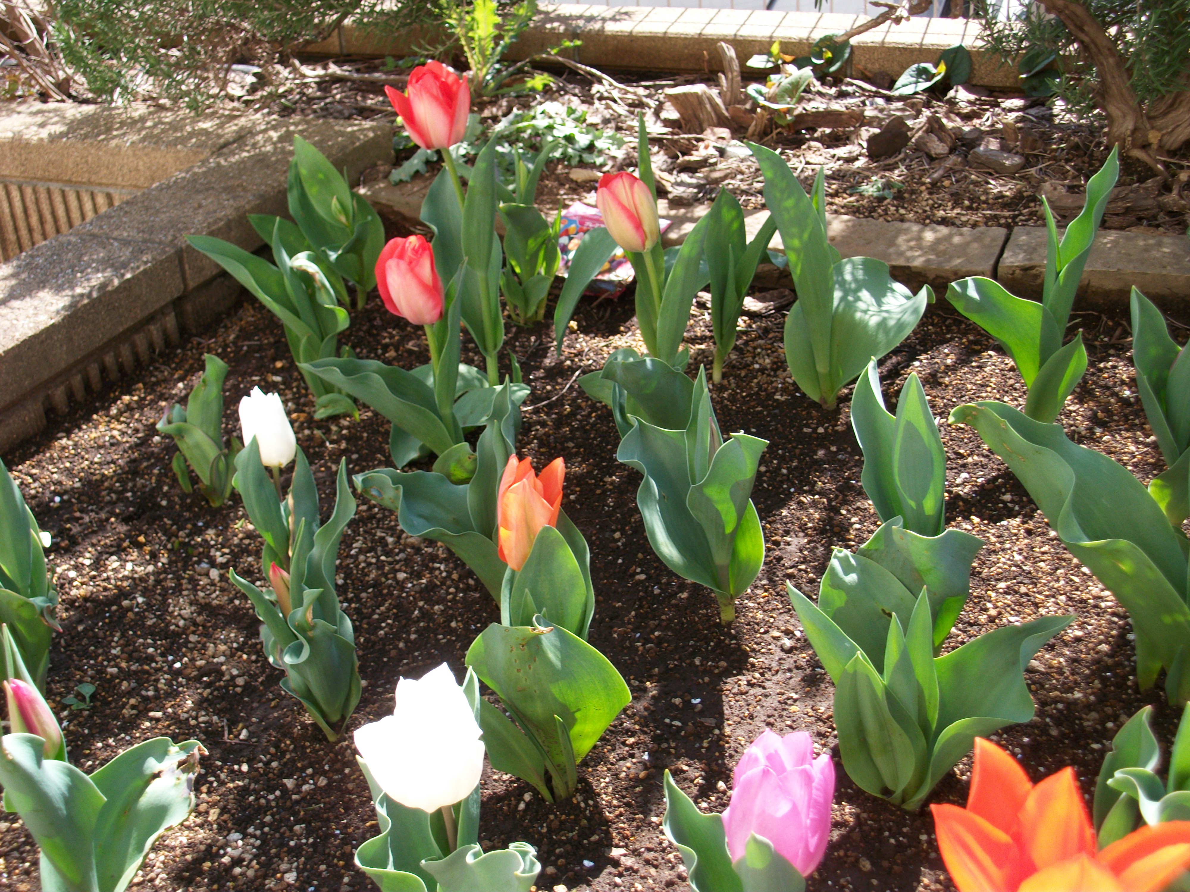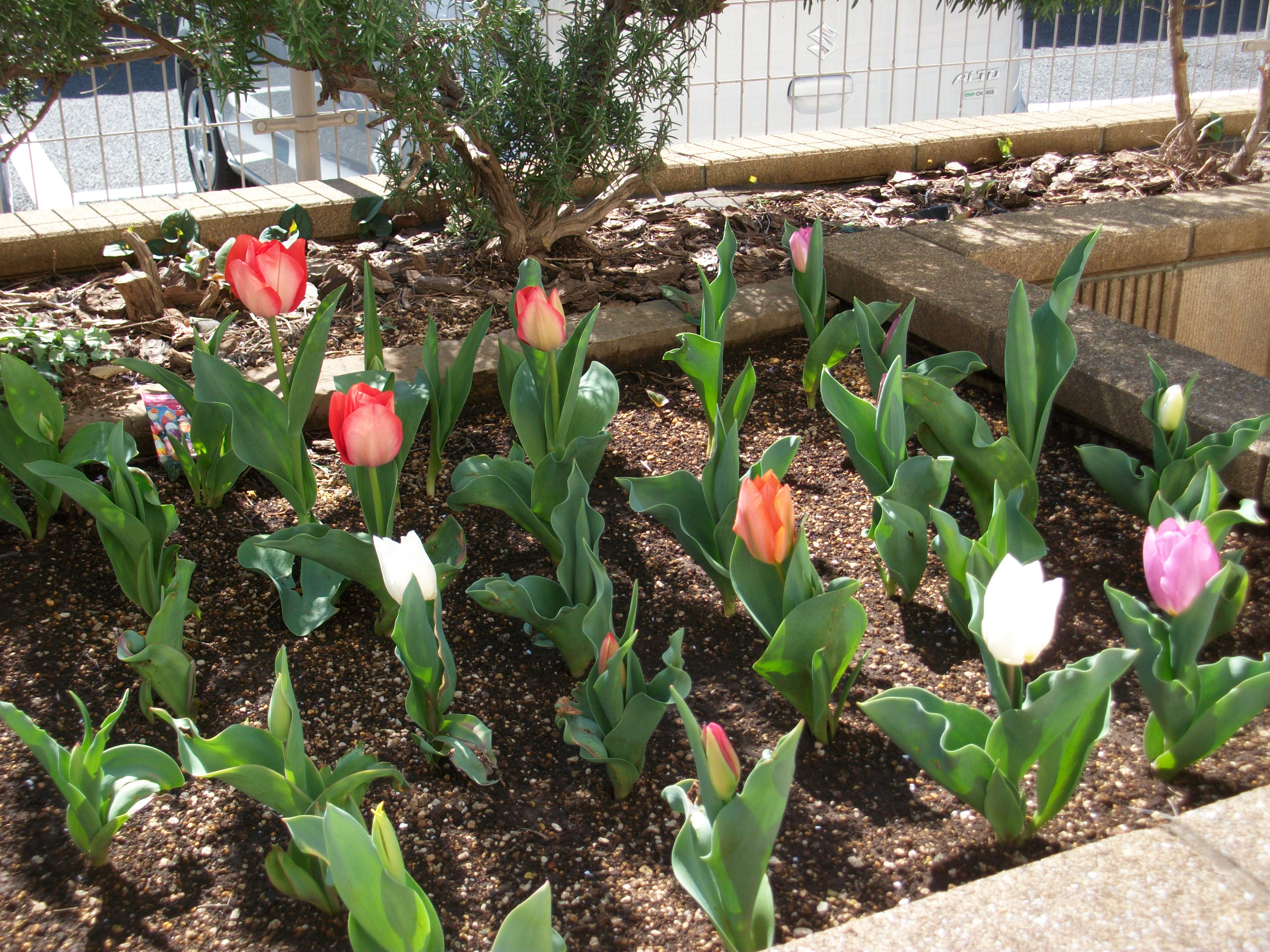 花壇植えたチューリップが色とりどりに咲き乱れ見ごろをむかえております。