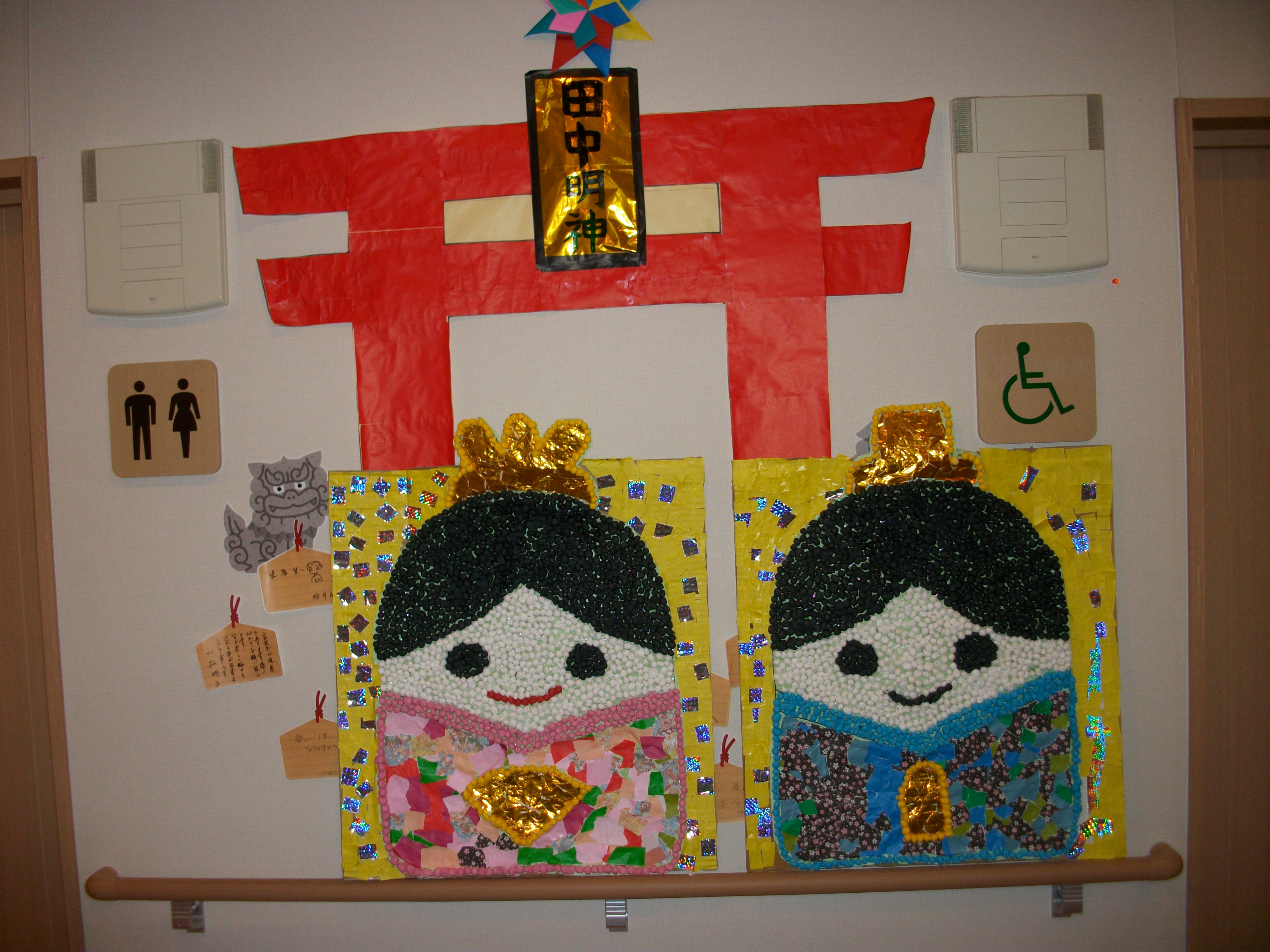 玄関先には大きな田中明神の鳥居の下で、可愛いお内裏様とお雛様がお出迎えです!
