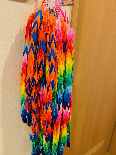 千羽鶴は子供たちが一生懸命に折ってくれて、