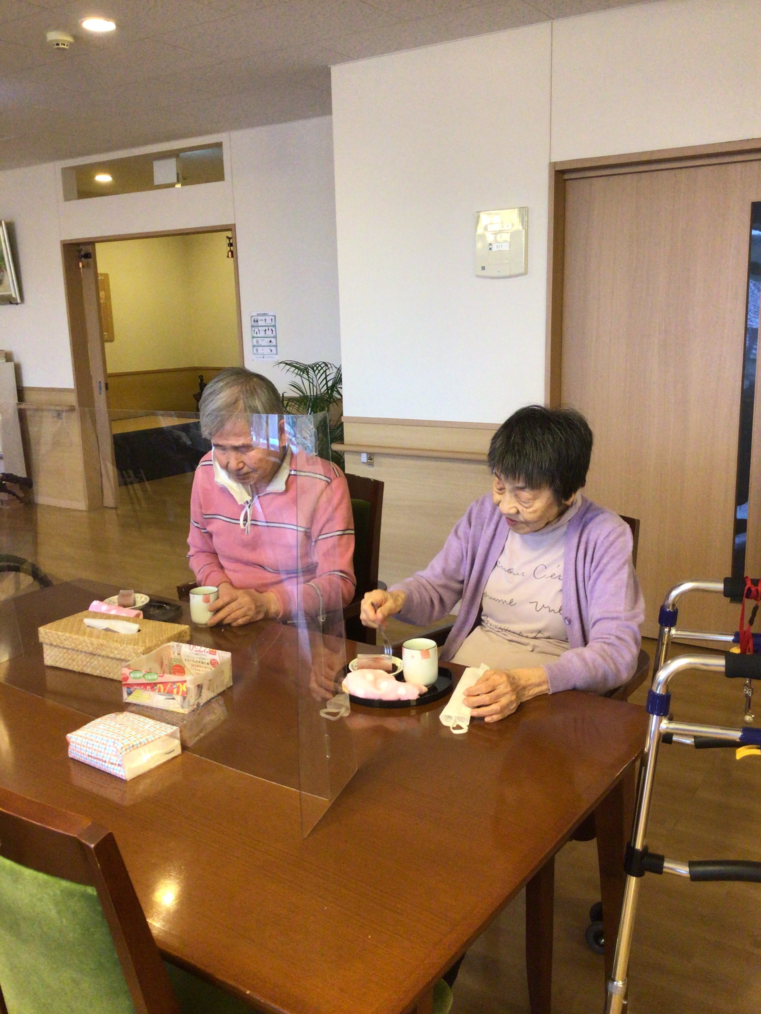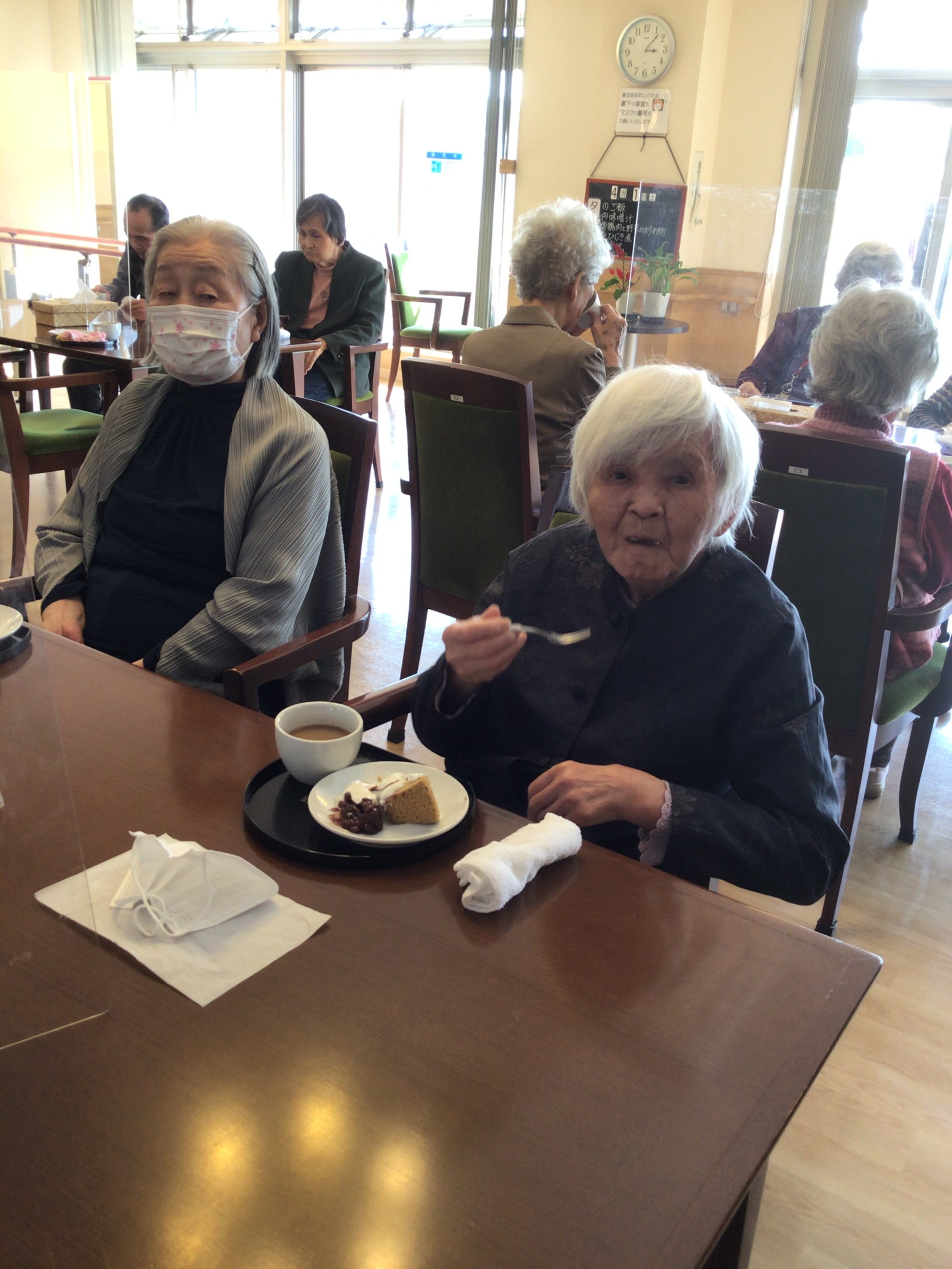 施設長考案の、手作り「桜シフォンケーキ」と手作り「さくら羊羹」を召し上がっていただきました。