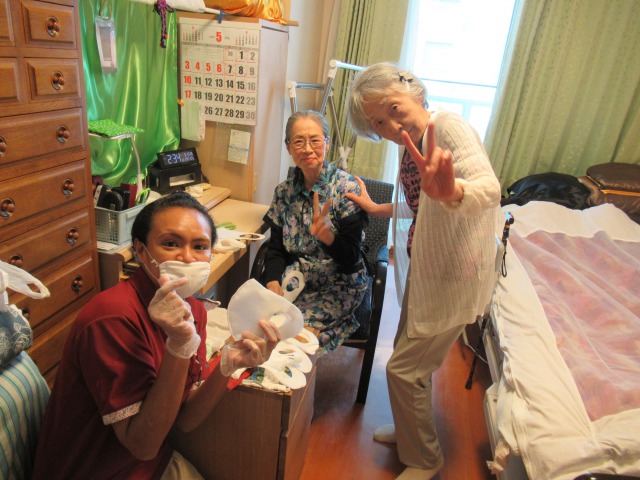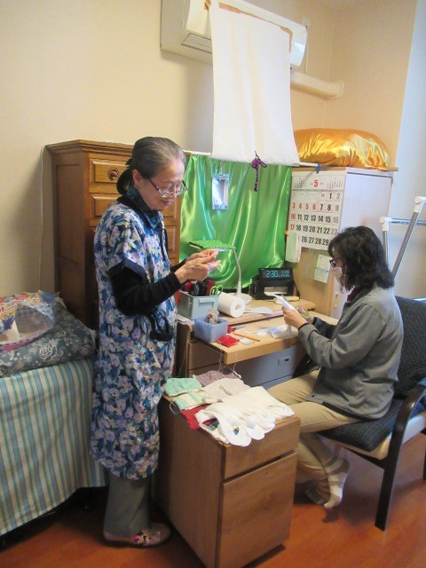 ご入居者様と一緒に使い捨ての手作りマスクを