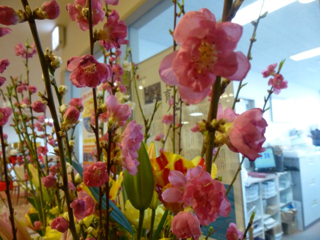 桃の花やチューリップ、旬のお花を飾っていますので、一度ぜひ見に来て下さいね。