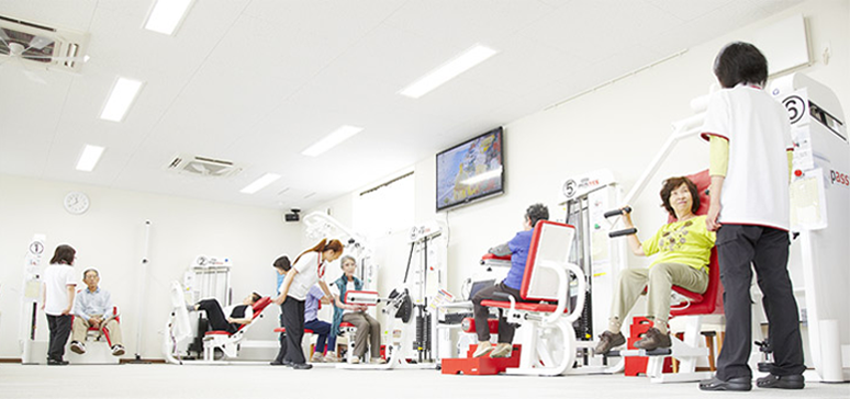 入居者様の乗り降りのしやすさに考慮し、入浴している時と同等の負荷で行うマシントレーニング。その効果は医学的にも認められています。機能改善の目的別で特性にあったマシンでリハビリテーションを行うことができます。
