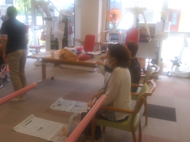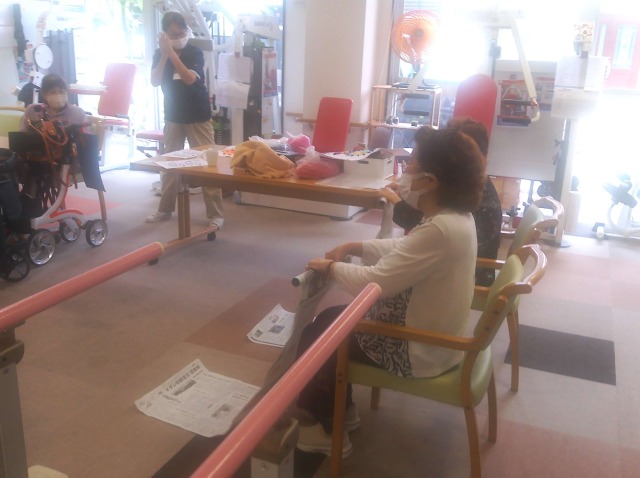 こんにちは、デイサービスです。今日はリハビリ職員による健康生活支援レクを行いました(*^-^*)まずは健康寿命やフレイル(加齢とともに心身の活力が低下し生活機能に支障がでてしまうこと)セルフチェックをしてご自身の体を知ることから始めました。続いて歩く力、下半身の筋力トレーニングや少し負荷の感じる運動を無理のない範囲で行いました。「いつまでもイキイキ、若々しくいたいよね」と皆様とても興味を持って参加してくださっていました(^^)/