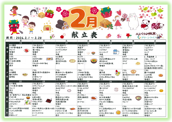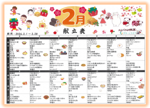 遅れておりました、2月の献立表が完成しました。