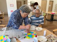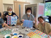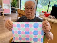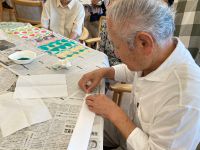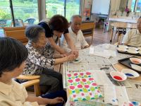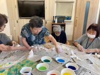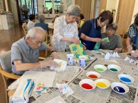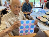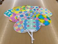 きれいに染めた半紙を使って、今年はうちわを作ります。