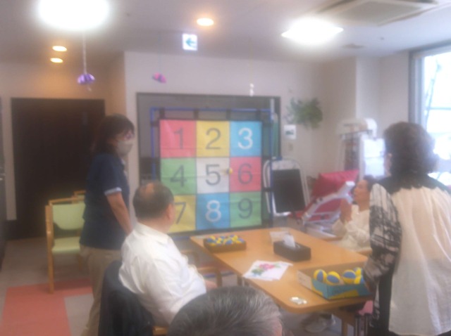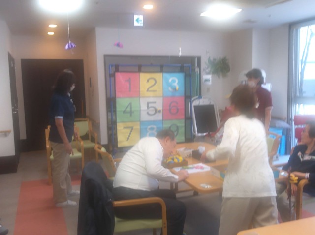 透明の花瓶でとても涼し気です。ご入居者様もスタッフも綺麗なお花と眺めていましたが・・・いざ、お花の名前は?「アガパンサス」「アフパンサス」「アゲサンパス」と人によって聞こえ方が違うようで途中からは皆で発声練習をしているみたいでした((´∀`))ご入居者様はしっかりとメモをとっていました。