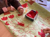 明るい赤やピンクでたくさんのお花を作っています。春はウキウキ楽しいですね!
