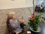 こんにちは、シーハーツ柏です。 生け花の作品を、ご自身の携帯電話のカメラに収める入居者様のご様子です。 「う~んと、もう少し離したほうがいいかな。」と、試行錯誤で何枚か写真を撮られていました。 グラジオラスやスプレー菊、この夏に合うお花たちです。ぜひ、ご家族にメールを送ってくださいね。