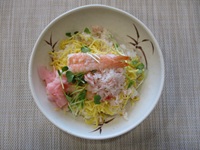⑤器に③を入れ、④をかけて、かまぼこ、⓶を上にのせて完成です。