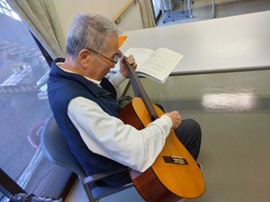 午後のホールでギターを弾かれる入居者様