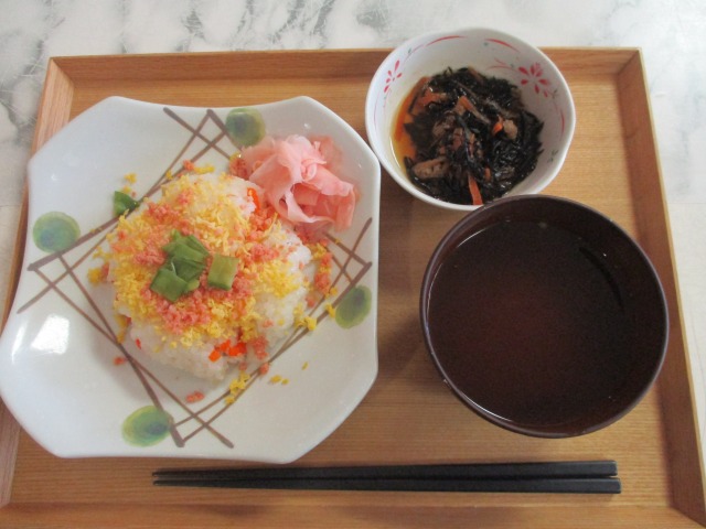 今日のお昼ごはんは何だろな~(・・?とフロアを眺めてみると【ちらし寿司】でした\(^o^)/暑くて食欲がない日でも、酢飯ならパクパク食べれるなんて事もありますよね(⋈◍>◡<◍)。✧♡暑い日が続きますが、皆様しっかりと召し上がっておられました‼