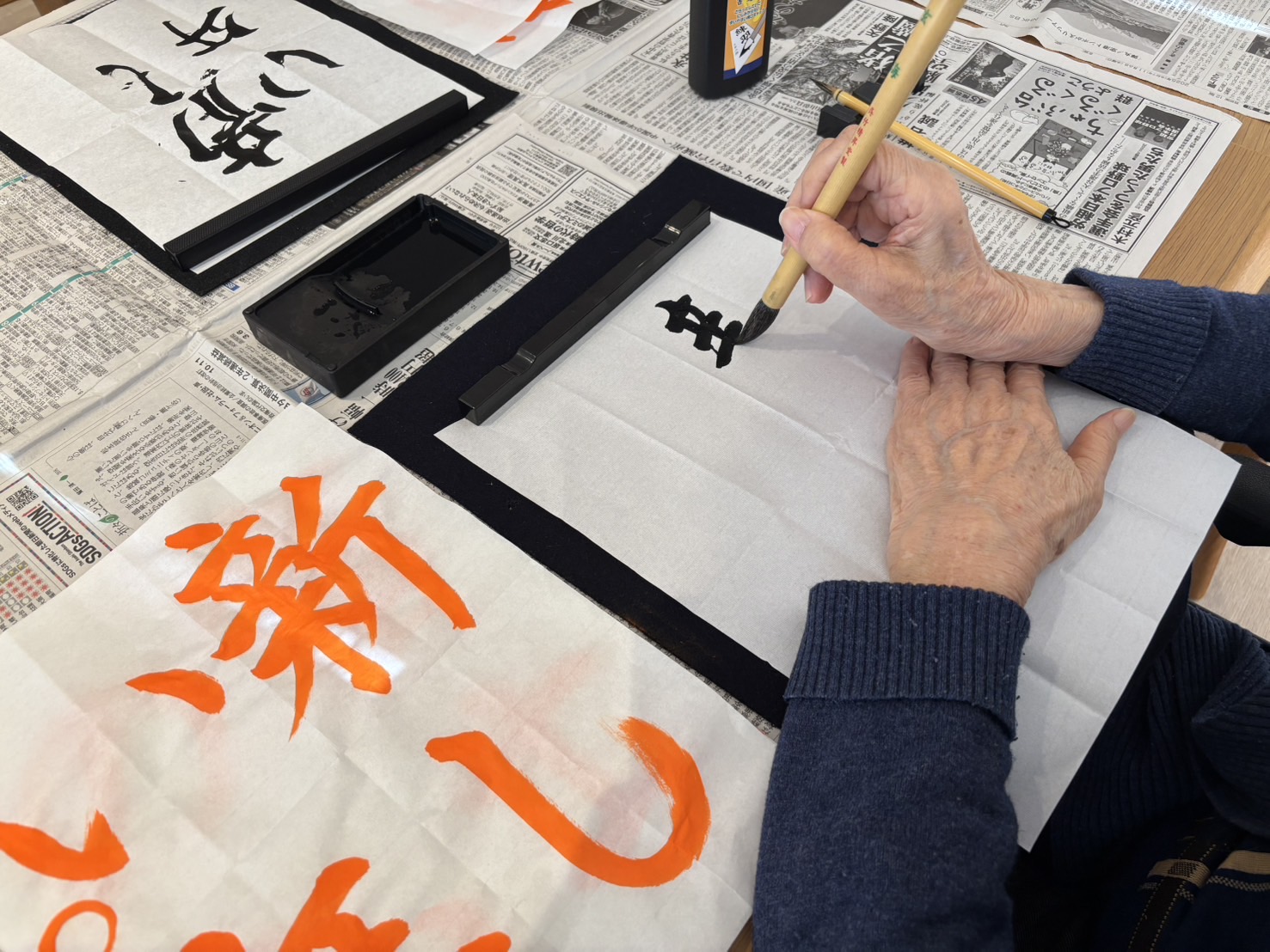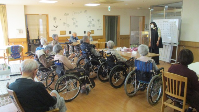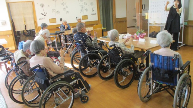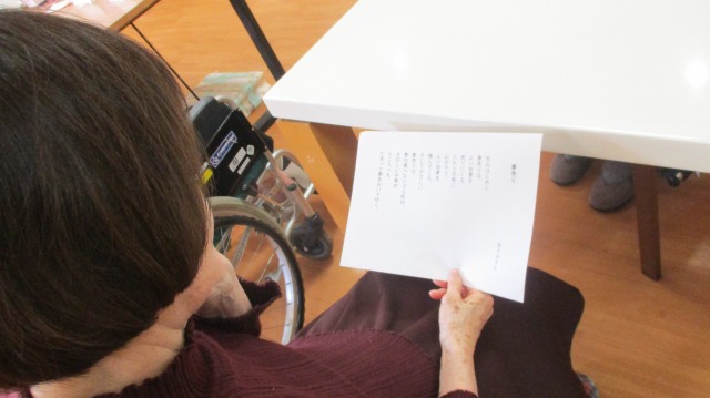 たくさんのご入居者様が集まってくださいました‼準備運動でしっかり大きな声が出るようになりました(^^♪今日の朗読は金子みすゞの『夢売り』です📚新年にふさわしい詩で、皆様の朗読にも熱が入ります‼一人ずつ読んでいただきましたが、どなたもスラスラと流暢に読まれていて本当に素晴らしかったです(*^-^*)最後は手遊び唄で頭の体操‼なかなか難しかったですが皆様一生懸命頑張っていました!(^^)!