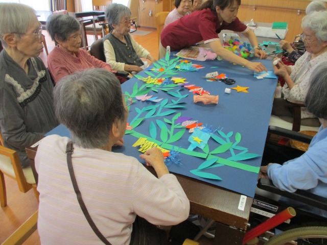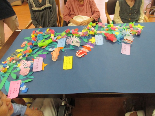 2階フロアでは女性陣が集まり、楽しそうな雰囲気で七夕🎋の飾りを作っておられました( *´艸`)皆様がこれまで力を合わせたこられた集大成がいよいよ!!色とりどりの飾りがとってもきれいですね✨✨✨下地の紺色にとても映えています🌟おっと!!記念記念撮影も忘れずに\(^o^)/