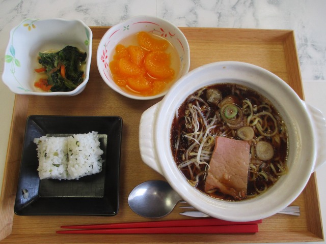 *おにぎり *富山ブラックラーメン *よごし(ほうれん草ごま味噌和え) *フルーツ