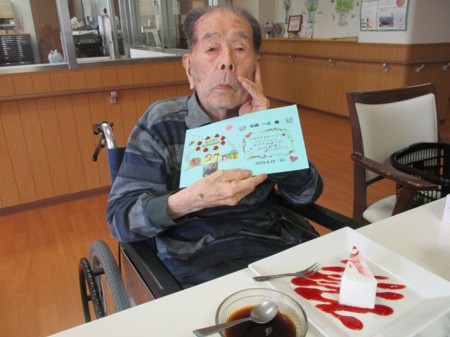 本日6月22日がお誕生日の方がおられました。おやつの時間に皆でお祝いをするとニコニコして「ありがとう!」と喜んでくださいました。でも・・カメラを向けると表情がかたくなって・・(涙)