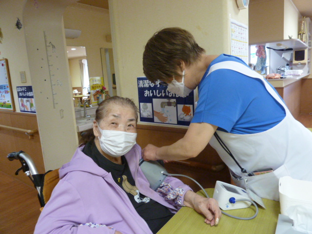 1階フロアへ行くと、入居者様の血圧を測ろうとする看護師の姿が・・・