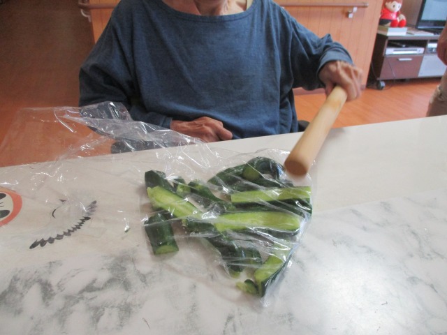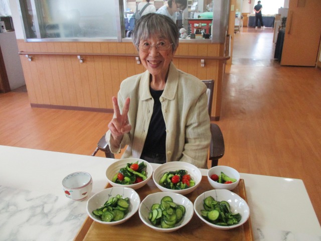 今日も屋上菜園ではきゅうりがなんと!!7本も収穫できました\(^o^)/ご利用者様と一緒にクッキング!!きゅうりを切ったり、たたいたり、たくさん手伝っていただきご覧のようにとってもおいしいお漬物が出来ました(^^♪夕食においしくいただきました( *´艸`)