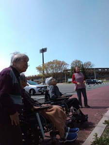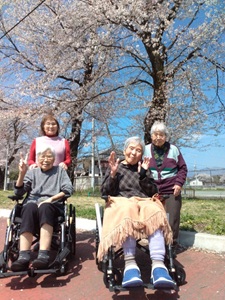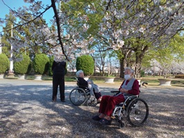 こんにちは、シーハーツ柏です。本日は、お日柄もよく絶好のお花見チャンスでしたので、近隣の松葉町公園に、お散歩に出かけました。 数百メートル距離がありましたので、入居者様にも頑張っていただきました。車椅子での坂道運転を体感していただいたことも、刺激になっています。桜も見ごろを迎え、施設に戻られた際には、「とってもきれいだったよ。行けてよかったです。」と、コメントをいただきました。 グループでの外出も、素敵な思い出になりますね。戻ってからいただいたおやつも工夫があり、桜の花びらつきのロールケーキに、「おおっ!花びらつきのケーキね。 春らしいね。」と、グッドサイン。5月の桜の新緑も楽しみです。