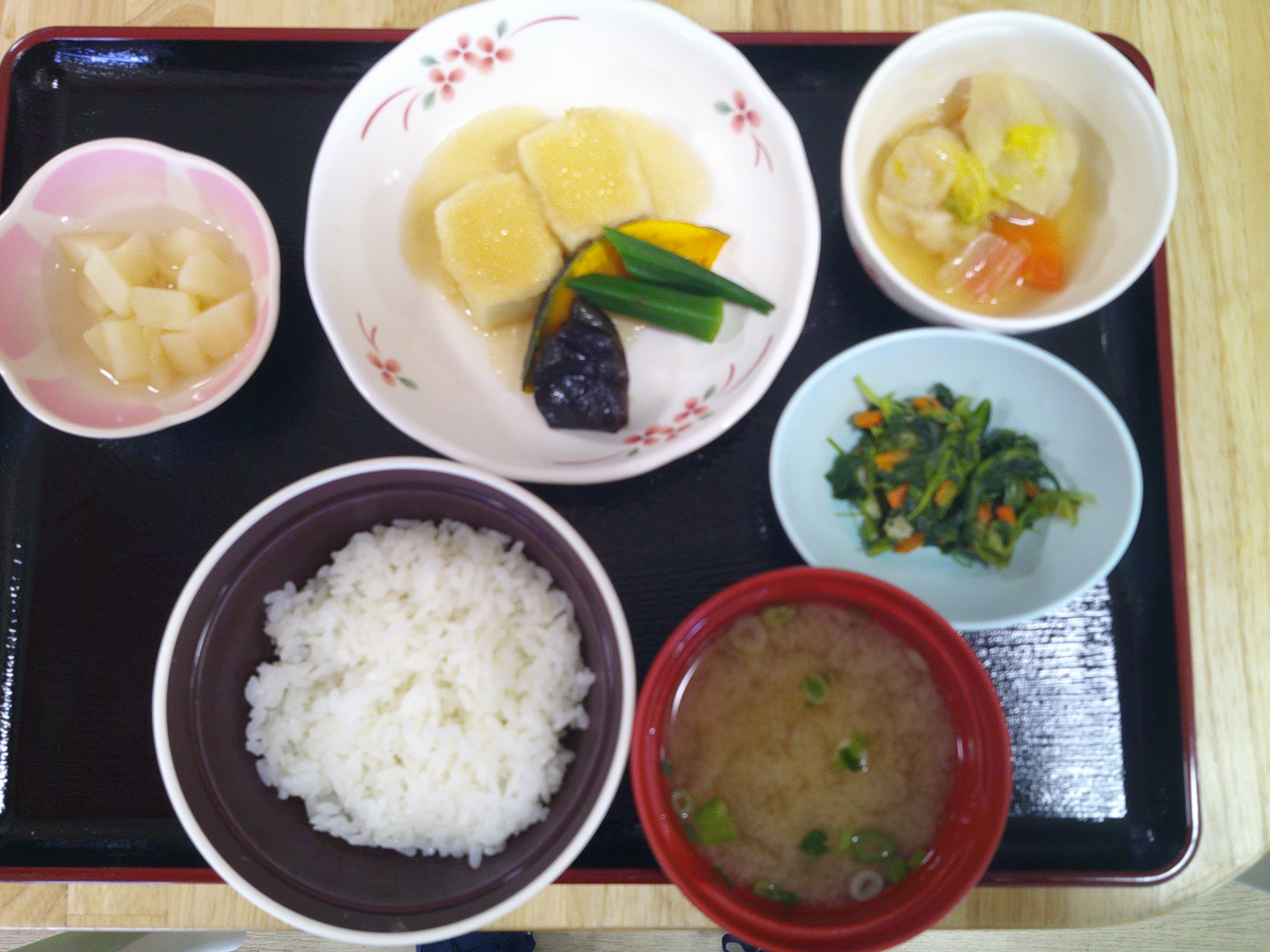 献立のメニューは、カレーうどんと蓮根の青海苔炒め、胡麻酢和えとフルーツです。