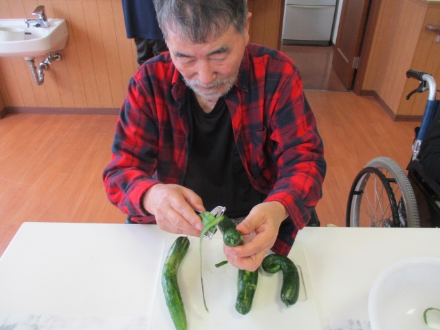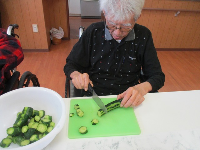 屋上で採れた【きゅうり】を今日は男性のご利用者様が頑張って調理してくださっていました(^^♪