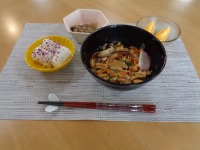 「豚と茄子の甘辛炒めの甘辛味がウドンとおにぎり合間の味変になり😋