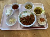今日のお昼ご飯は、キーマカレー、コールスローサラダ、卵とじ、