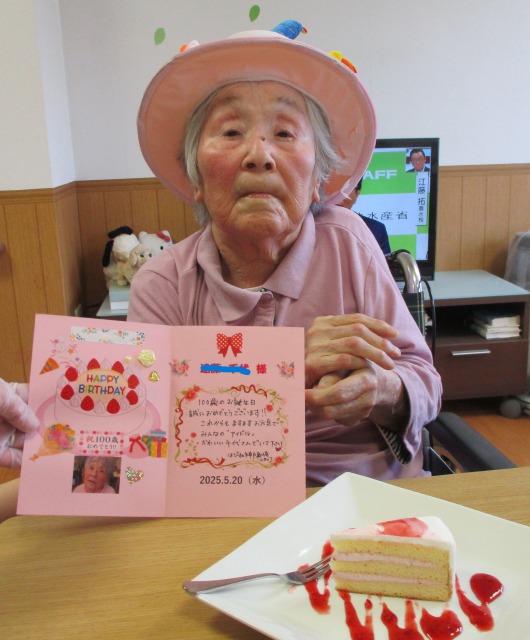 今日はご利用者様のお誕生日です(*^-^*)なんと‼本日めでたく『100歳』を迎えられました🎊(/・ω・)/🎊とてもお元気で、若々しく、ケーキもペロリと完食されました( *´艸`)これからもますますお元気でいてください‼本当におめでとうございます(*^▽^*)