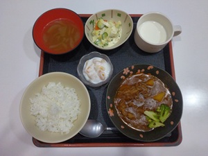「ご飯」「オニオンスープ」「ビーフシチュー」「マセドアンサラダ」「フルーツヨーグルト」「牛乳」でした。「マセドアンサラダ」私は初めて聞いたメニューですが、フランス料理の一つで、色とりどりの野菜を小さな角切りにし、ドレッシングで和えたサラダとの事です。入居者様には食べやすそうでした♪