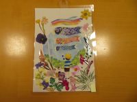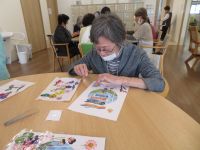 今月の押し花教室は、鯉のぼりのイラストを華やかに飾り付けました。