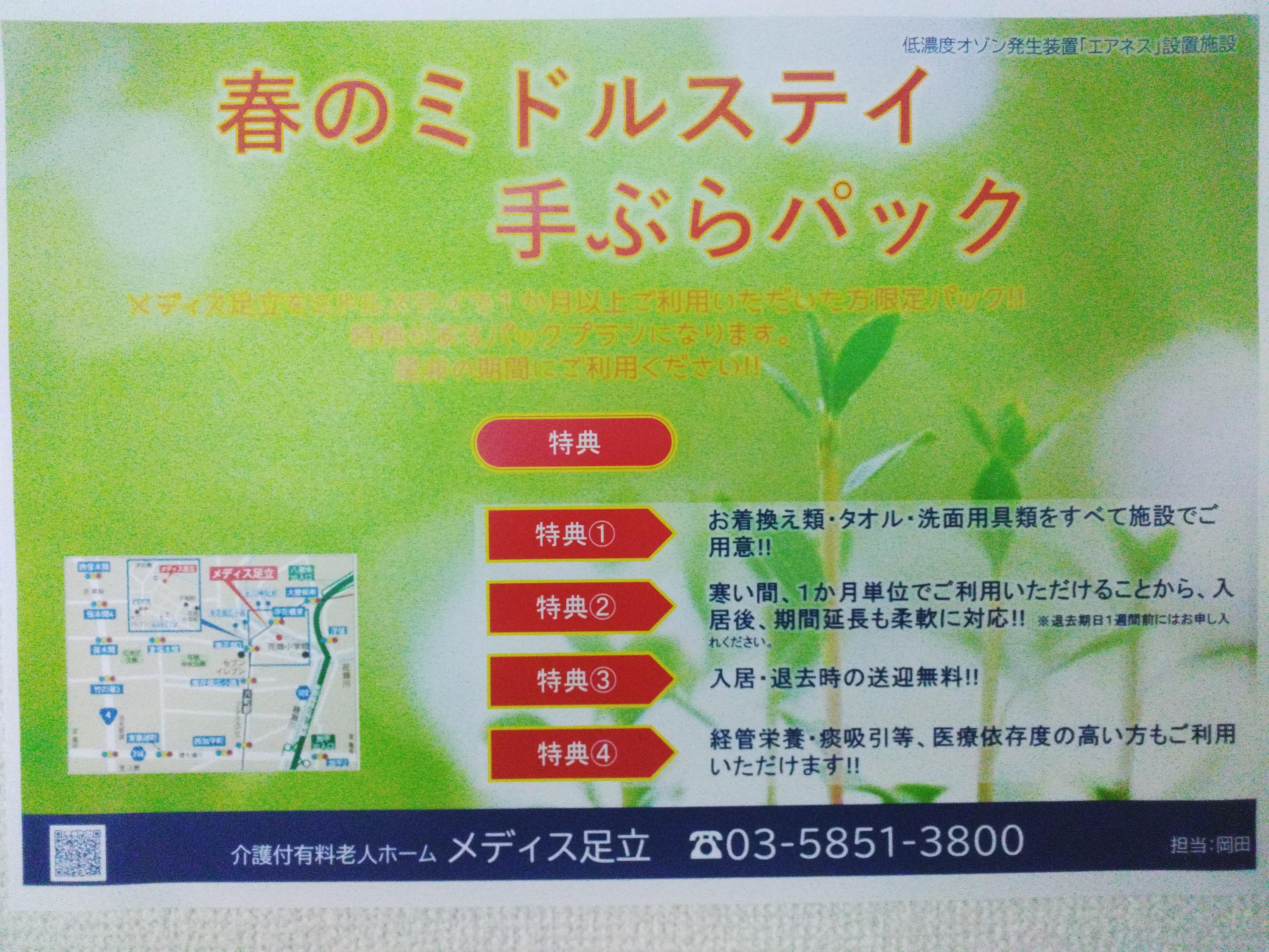 この度、メディス足立では、お手軽にご利用ができる「春のミドルステイ手ぶらパック」プランを実施中!一時金が無い施設だからこそ出来るサービスとなっております。