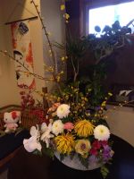 今年最初のお花はカラフルで「春」という感じがします。お正月のお花もまだ元気で松を取り飾っていて先生が手直ししてくださいました。お正月のお花も好評で皆様、写真を撮ってフォトスポットになっていましたと伝えたら先生も喜んでいました。