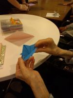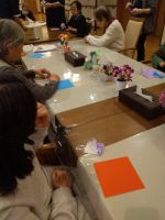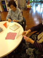端午の節句は過ぎましたがスタッフに教わりながら一生懸命に折っていました。教えているスタッフも本を見ながら悪戦苦闘していましたが色々な色の兜が完成しました。