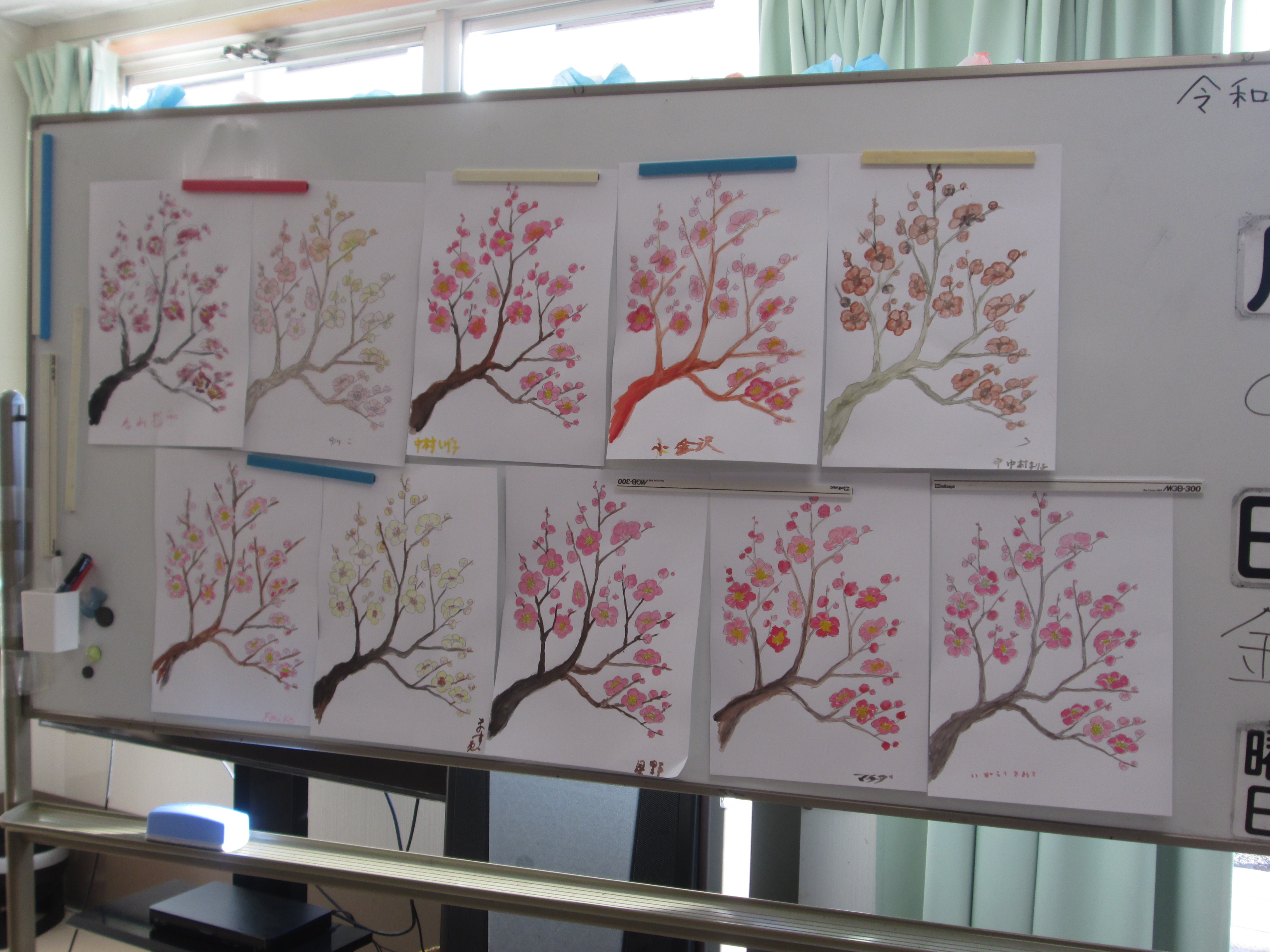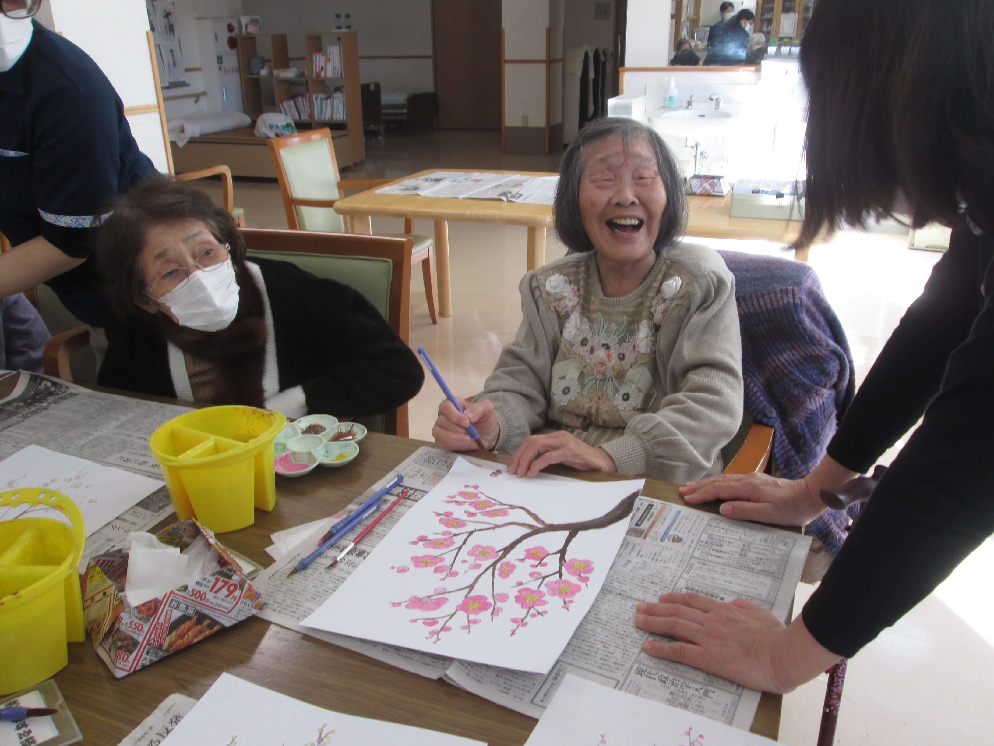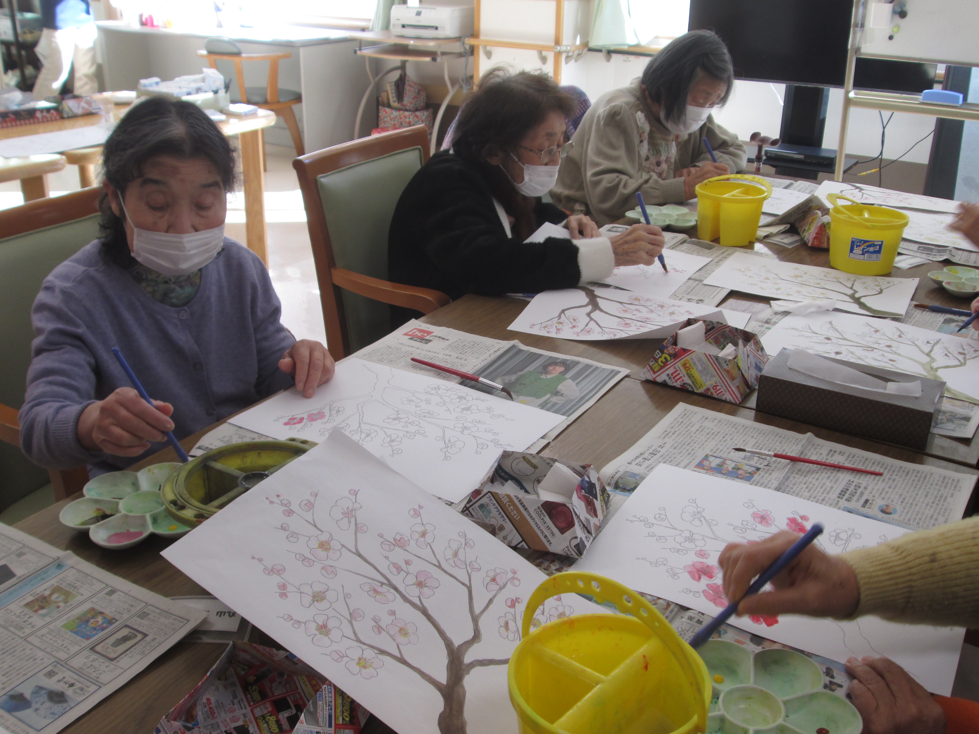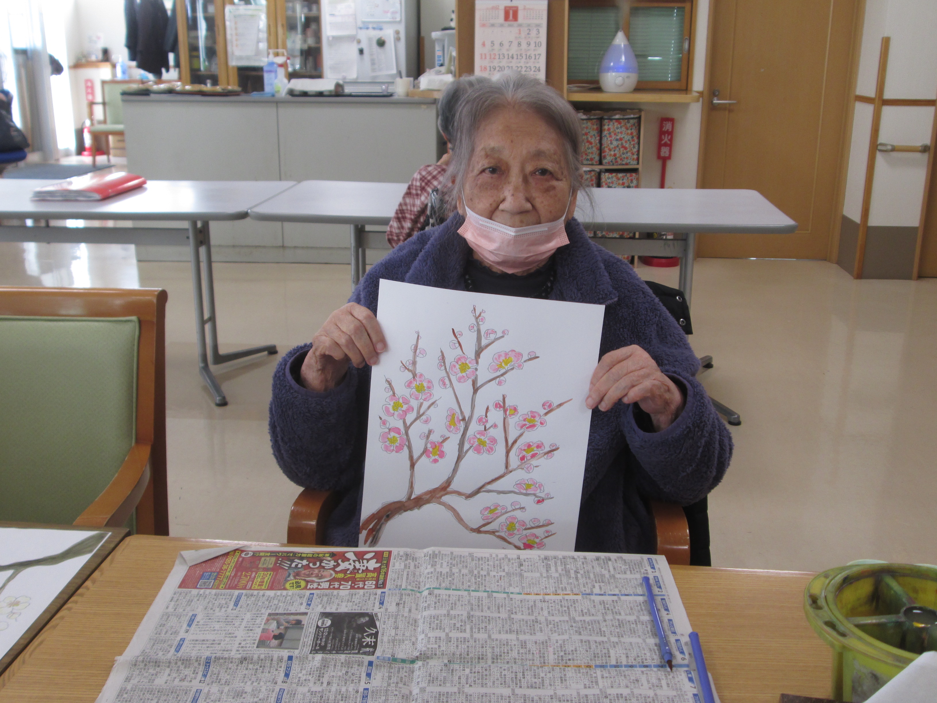こんにちはデイサービスです。今日のレクは、今年最初の水彩画(梅の花)です。皆様水彩画の道具を渡されると「うわぁ、梅の花だねぇ。綺麗だね(*^-^*)」と一言。早速、取り掛かると皆様真剣に取り組まれ「あなた上手に塗れてるね」「私、絵は苦手なんだよ(笑)」と笑いながらお互いの絵をほめ合ったりしていました(≧▽≦) とても素晴らしい水彩画が出来上がりましたのでデイルームの展示コーナーに飾らせていただきます。