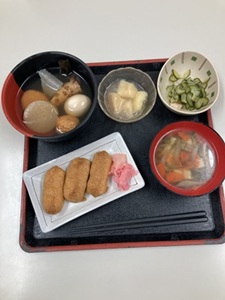 本日の昼食は「いなり寿司」「けんちん汁」「おでん」「胡瓜と海老の酢の物」「フルーツ」でした。寒い季節に「おでん」いいですよね。