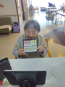 お誕生日が近いということで、プレゼントの開封式を行いました。ご家族とお話しできて良い笑顔が見られていました。