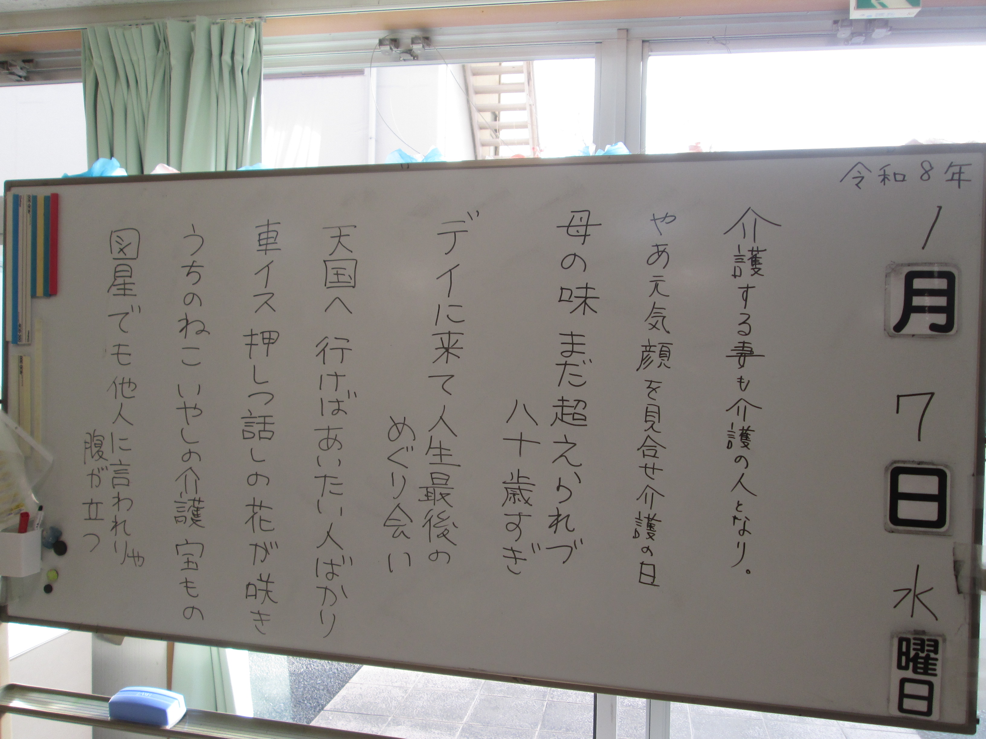 こんにちはデイサービスです。本日のレクは今年最初の介護川柳を行いました。介護川柳は苦手という方が多くなかなか筆が進みませんでしたが、苦戦しながらも皆様集中して取り組んでいただきとても素敵な作品を書いていただきました(^^♪ いくつかご紹介します! 「介護する妻も介護の人となり」「デイに来て人生最後のめぐり逢い」「うちの猫癒しの介護宝物」など思い思いの作品を作って頂きました。 なかには「なかなか思い浮かばないから家で考えてくるからね♪」などと仰る方もおりました(^^♪ また来月の介護川柳が今から楽しみです(^^♪