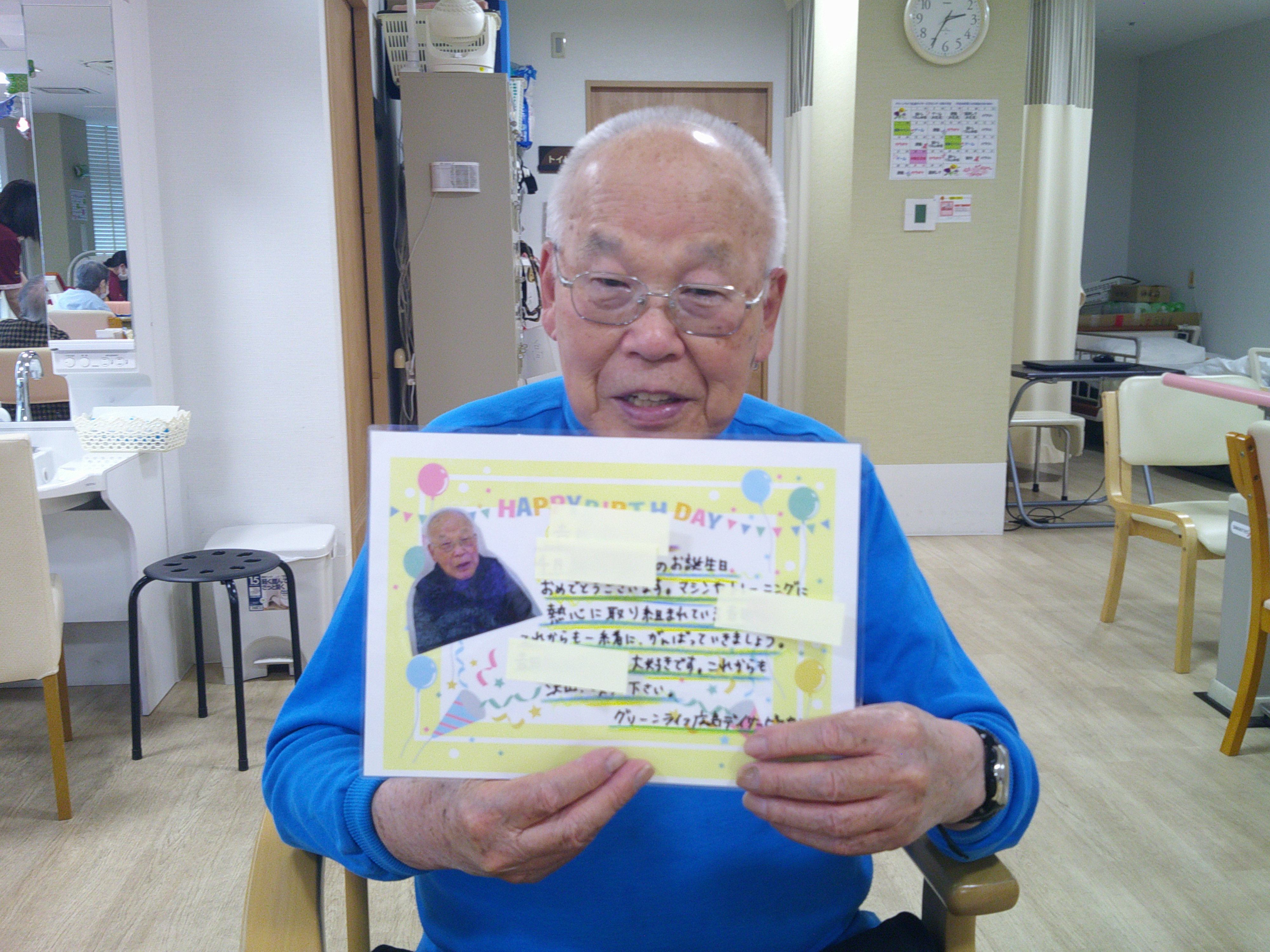 「頑張る姿の写真を撮らせてください♪」とお願いしたのに、手を挙げて笑顔のポーズを決めた、おちゃめな入居者様でした~(*^^*)