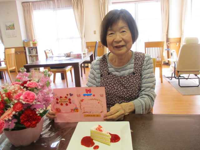 ご家族様よりお花が届き、おやつ時にはバースデーケーキでお祝いさせていただきました(*^-^*)きれいなお花と記念撮影📸✨とても喜んでおられました🌟おめでとうございます🎊これからもお元気でいてください‼